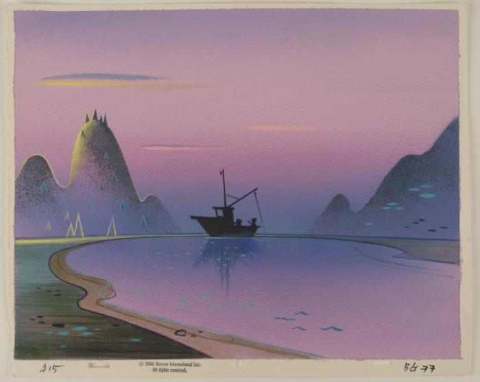 This is an original hand-painted background is from the Nickelodeon TV show Ren & Stimpy. The show follows two characters - Ren, a crazy Chihuahua - and - Stimpy, an incredibly stupid cat - as they think up to all kinds of hair brained schemes and get themselves into some sticky situations. The Ren and Stimpy Show debuted in August 1991 with a two-part episode, 'Stimpy's Big Day / The Big Shot' and became an instant hit. It was the third Nicktoon ever to be aired on the Network alongside Doug and Rugrats. It seems to be some people fishing on a pond. Original Production Background Overall Size of Background: 10 1/2" x 13" Very good condition; it has been stored Original Production Backgrounds are used in the making of the final version of animated productions. The background establishes the location and the overall good mood of the scenee. Typically, a background layout artist creates a drawing to establish the content of the scene, placement of characters, perspective and camera angle. Based on this drawing, the background artist creates a preliminary painting to confirm all of the scenes details, then the final production background which is used in the filming of the scene. When these backgrounds are individually photographed behind the progression of production cels, and projected at a rapid succession, the images in the foreground appear to move, creating an animated scene. The background is ready to be matted and framed. It is a colored background with the animator's notations at the bottom.
