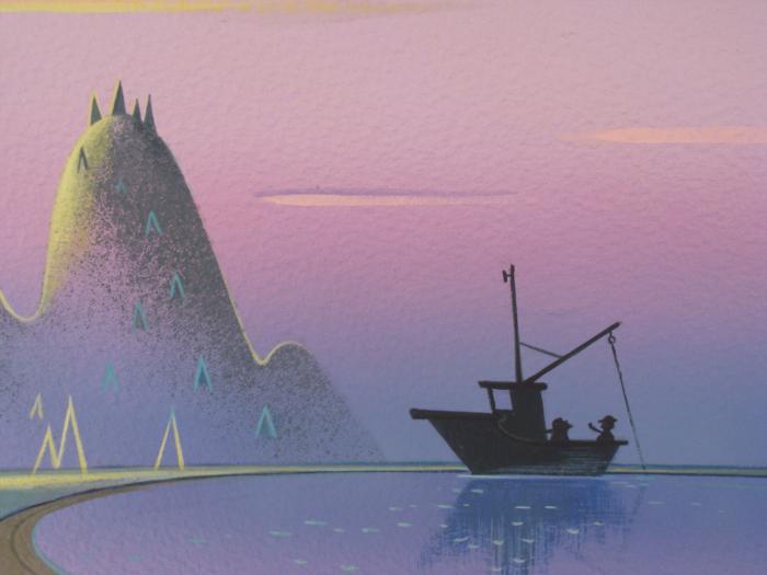 This is an original hand-painted background is from the Nickelodeon TV show Ren & Stimpy. The show follows two characters - Ren, a crazy Chihuahua - and - Stimpy, an incredibly stupid cat - as they think up to all kinds of hair brained schemes and get themselves into some sticky situations. The Ren and Stimpy Show debuted in August 1991 with a two-part episode, 'Stimpy's Big Day / The Big Shot' and became an instant hit. It was the third Nicktoon ever to be aired on the Network alongside Doug and Rugrats. It seems to be some people fishing on a pond. Original Production Background Overall Size of Background: 10 1/2" x 13" Very good condition; it has been stored Original Production Backgrounds are used in the making of the final version of animated productions. The background establishes the location and the overall good mood of the scenee. Typically, a background layout artist creates a drawing to establish the content of the scene, placement of characters, perspective and camera angle. Based on this drawing, the background artist creates a preliminary painting to confirm all of the scenes details, then the final production background which is used in the filming of the scene. When these backgrounds are individually photographed behind the progression of production cels, and projected at a rapid succession, the images in the foreground appear to move, creating an animated scene. The background is ready to be matted and framed. It is a colored background with the animator's notations at the bottom.