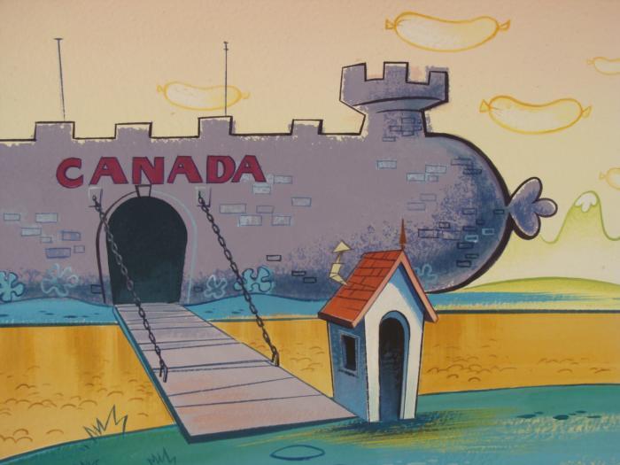 This original hand-painted background is from the Nickelodeon TV show Ren & Stimpy. The show follows two characters - Ren, a crazy Chihuahua - and - Stimpy, an incredibly stupid cat - as they think up to all kinds of hair brained schemes and get themselves into some sticky situations. The Ren and Stimpy Show debuted in August 1991 with a two-part episode, 'Stimpy's Big Day / The Big Shot' and became an instant hit. It was the third Nicktoon ever to be aired on the Network alongside Doug and Rugrats. Welcome to the infamous Canadian Castle that is in a shape of a Weiner. Original Production Background Overall Size: 10 1/2" x 13" Very good condition; it has been storedOriginal Production Backgrounds are used in the making of the final version of animated productions. The background establishes the location and the overall good mood of the scenee. Typically, a background layout artist creates a drawing to establish the content of the scene, placement of characters, perspective and camera angle. Based on this drawing, the background artist creates a preliminary painting to confirm all of the scenes details, then the final production background which is used in the filming of the scene. When these backgrounds are individually photographed behind the progression of production cels, and projected at a rapid succession, the images in the foreground appear to move, creating an animated scene. The background is to be matted and framed. It is a colored background with the animator's notations shown at the bottom.