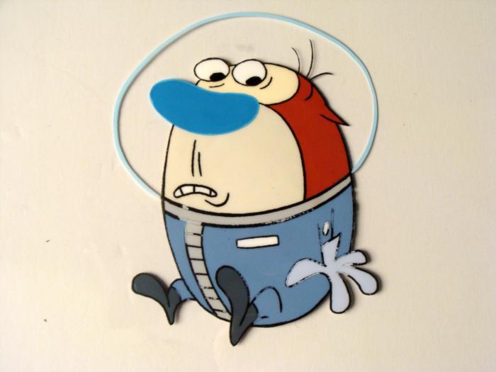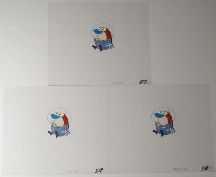 This is an original production animation cel from the Nickelodeon TV show Ren & Stimpy. The show follows two characters - Ren, a crazy Chihuahua - and - Stimpy, an incredibly stupid cat - as they think up to all kinds of hair brained schemes and get themselves into some sticky situations. The Ren and Stimpy Show debuted in August 1991 with a two-part episode, 'Stimpy's Big Day / The Big Shot' and became an instant hit. It was the third Nicktoon ever to be aired on the Network alongside Doug and Rugrats. Shown here are a sequence of three cels of Stimpy from the same epsiode. In this cel, Stimpy appears to be a bit nervous in his space suit.Original Production Art Cel Overall Size of Cels: 10 1/2" x 12 1/2" Excellent condition This is an original hand-painted cel set-up used in the production of an episode of "The Ren & Stimpy Show." Each one-of-a-kind set-up represents a slight change in position of the characters. When individually photographed and projected in rapid succession, the images appear to move.