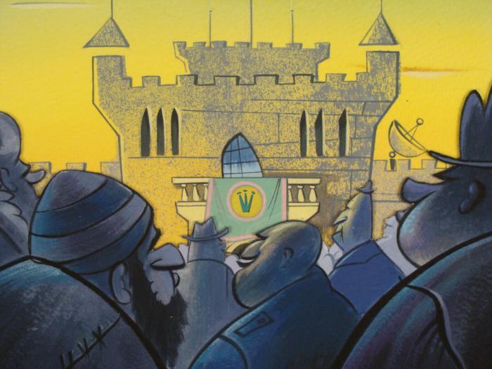 This original production art cel and background is from the Nickelodeon TV show Ren & Stimpy. The show follows two characters - Ren, a crazy Chihuahua - and - Stimpy, an incredibly stupid cat - as they think up to all kinds of hair brained schemes and get themselves into some sticky situations. The Ren and Stimpy Show debuted in August 1991 with a two-part episode, 'Stimpy's Big Day / The Big Shot' and became an instant hit. It was the third Nicktoon ever to be aired on the Network alongside Doug and Rugrats. Show here is an apparently angry crowd gathering in front of a castle, looking on to it ahead.Original Production Art CelOriginal Production Background Overall Size: 10 1/2" x 13"Excellent condition This is an original hand-painted cel set-up used in the production of an episode of "The Ren & Stimpy Show." Each one-of-a-kind set-up represents a slight change in position of the characters. When individually photographed and projected in rapid succession, the images appear to move.