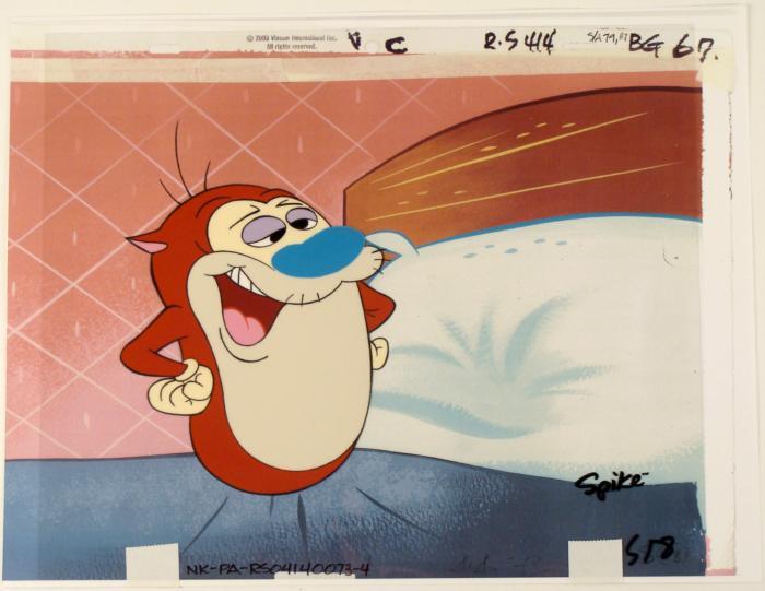 This is an original production animation cel from the Nickelodeon TV show Ren & Stimpy. The show follows two characters - Ren, a crazy Chihuahua - and - Stimpy, an incredibly stupid cat - as they think up to all kinds of hair brained schemes and get themselves into some sticky situations. The Ren and Stimpy Show debuted in August 1991 with a two-part episode, 'Stimpy's Big Day / The Big Shot' and became an instant hit. It was the third Nicktoon ever to be aired on the Network alongside Doug and Rugrats. Here, Stimpy appears to have that look of satisfaction on his face.Original Production Art Cel Cel Overall Size of the Cel: 10 1/2" x 12 1/2" Overall Size of the Background: 11" x 14 1/4" Excellent condition This is an original hand-painted cel set-up used in the production of an episode of "The Ren & Stimpy Show." Each one-of-a-kind set-up represents a slight change in position of the characters. When individually photographed and projected in rapid succession, the images appear to move.
