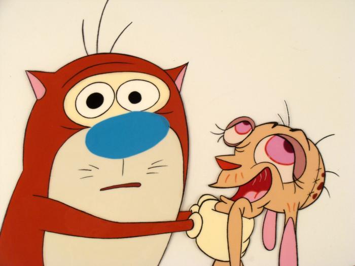 This is an original production animation cel from the Nickelodeon TV show Ren & Stimpy. The show follows two characters - Ren, a crazy Chihuahua - and - Stimpy, an incredibly stupid cat - as they think up to all kinds of hair brained schemes and get themselves into some sticky situations. The Ren and Stimpy Show debuted in August 1991 with a two-part episode, 'Stimpy's Big Day / The Big Shot' and became an instant hit. It was the third Nicktoon ever to be aired on the Network alongside Doug and Rugrats. What else can Stimpy do? It appears that Ren is being unresponsive...Original Production Art Cel Overall Size of the Cel: 10 1/2" x 1/2" Excellent condition This is an original hand-painted cel set-up used in the production of an episode of "The Ren & Stimpy Show." Each one-of-a-kind set-up represents a slight change in position of the characters. When individually photographed and projected in rapid succession, the images appear to move.