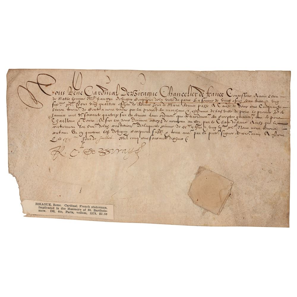 French cardinal and chancellor (1506–1583) who was implicated in the 1572 St. Bartholomew's Day Massacre. Vellum manuscript DS, in French, signed “R. C. de Birague,†one page, 10.25 x 5.5, July 1578. Official document signed by Rene Cardinal de Birague as Chancellor of France. The white paper seal affixed to the lower right remains intact. In fine condition, with loss to the lower left corner and an old affixed catalog caption.