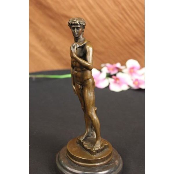 The Bronze Replica Of David Is A Masterpiece Of Renaissance Sculpture Created Between 1501 And 1504, By The Italian Artist Michelangelo. The Statue Represents The Biblical Hero David, A Favored Subject In The Art Of Florence. ly Commissioned As One Of A Series Of Statues Of Prophets To Be Positioned Along The Roof Line Of The East End Of Florence Cathedral, The Statue Was Instead Placed In A Public Square, Outside The Palazzo Della Signoria, The Seat Of Civic Government In Florence, Where It Was Unveiled On 8 September 1504. Because Of The Nature Of The Hero That It Represented, It Soon Came To Symbolize The Defense Of Civil Liberties Embodied In The Florentine Republic, An Independent City-State Threatened On All Sides By More Powerful Rival States And By The Hegemony Of The Medici Family. The Eyes Of David, With A Warning Glare, Were Turned Towards Rome. This Relic Work Of Art Was Cast Using The Ancient Method Of Lost-Wax Casting And Stained With A Brown Patina Finish For Preservation. David Stands Upon A Black, Variegated Black Marble Base. Bronze dimensions with marble base: Height 11 X Width 5 inches. Weight: 5 lbs.Please Note: This is a reproduction bronze sculpture from the original molded and signed. This featured bronze sculpture is a recast after the original, and has been done recently. This 100% bronze sculpture is an abstract piece certain to be a conversation piece.Please Note: This is a reproduction bronze sculpture from the original molded and signed. This featured bronze sculpture is a recast after the original, and has been done recently. This 100% bronze sculpture is an abstract piece certain to be a conversation piece.