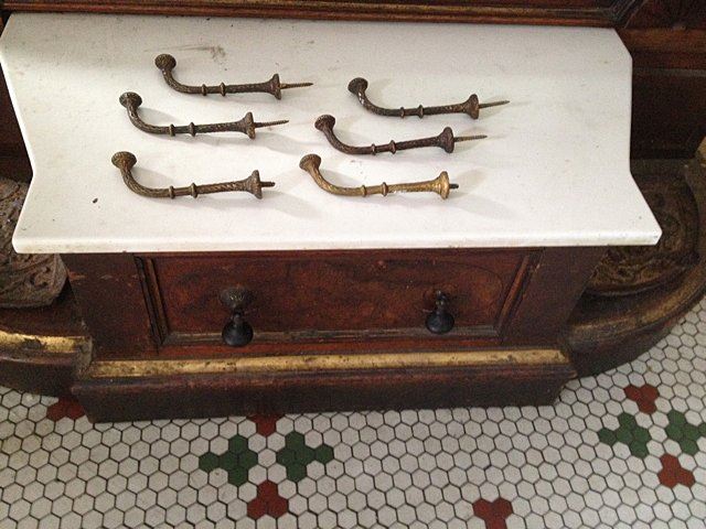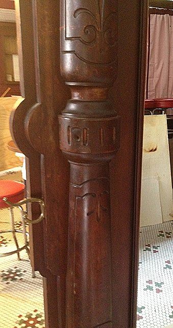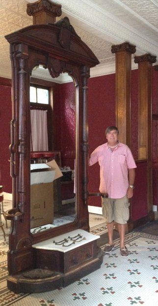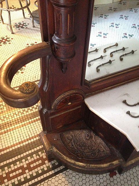 Well over 100 years old, Monumental Hall Tree with Mirror. All original finish, has the original hooks, the original cast iron drip pans that are in the shape of winged bats with faces. The umbrella holders are lamenated in 3 lamenents each. Has it's original gold incising throughout the piece. Has the Italian marble shelf, flanked drawer underneath with burl throughout the crest. Crest removes easily at the top. The sides come off for the umbrella holders, marble top, marble shelf comes off, drawer at base comes out, cast iron drip pans come out. Measures approx. 56" wide x 9 1/2 feet tall. The piece is an extradinary master craftsmen built piece. Was rumored to be in a famous railroad station, quite possibly Grand Central Station in New York City. In the magnificant splendor of a golden era, this Renaissance Revival Hall tree with mirror will be a focal point and statement piece for anyone who appreciates the craftsmanship and carvings of the Victorian era. This is piece is not just a piece of furniture, but a piece of history. Just absolutely phenominal in style and craftsmanship! We certainly do not see many of these extraordinary pieces in the marketplace today.