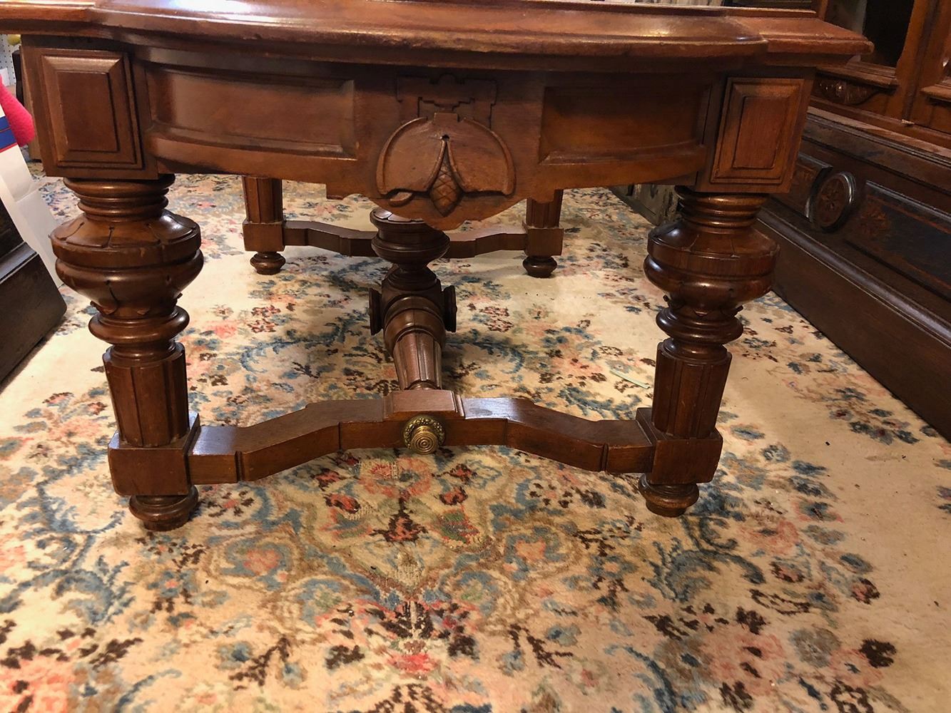 Monumental Renaissance Revival marble top table, heavily carved drawer, white tombstone shaped insert marble, black walnut, huge finial in center. Looks like a horse shoe and Fluer-de-lis on drawer. Ends each have carved horseshoe, acorn, and looks to be leaves.