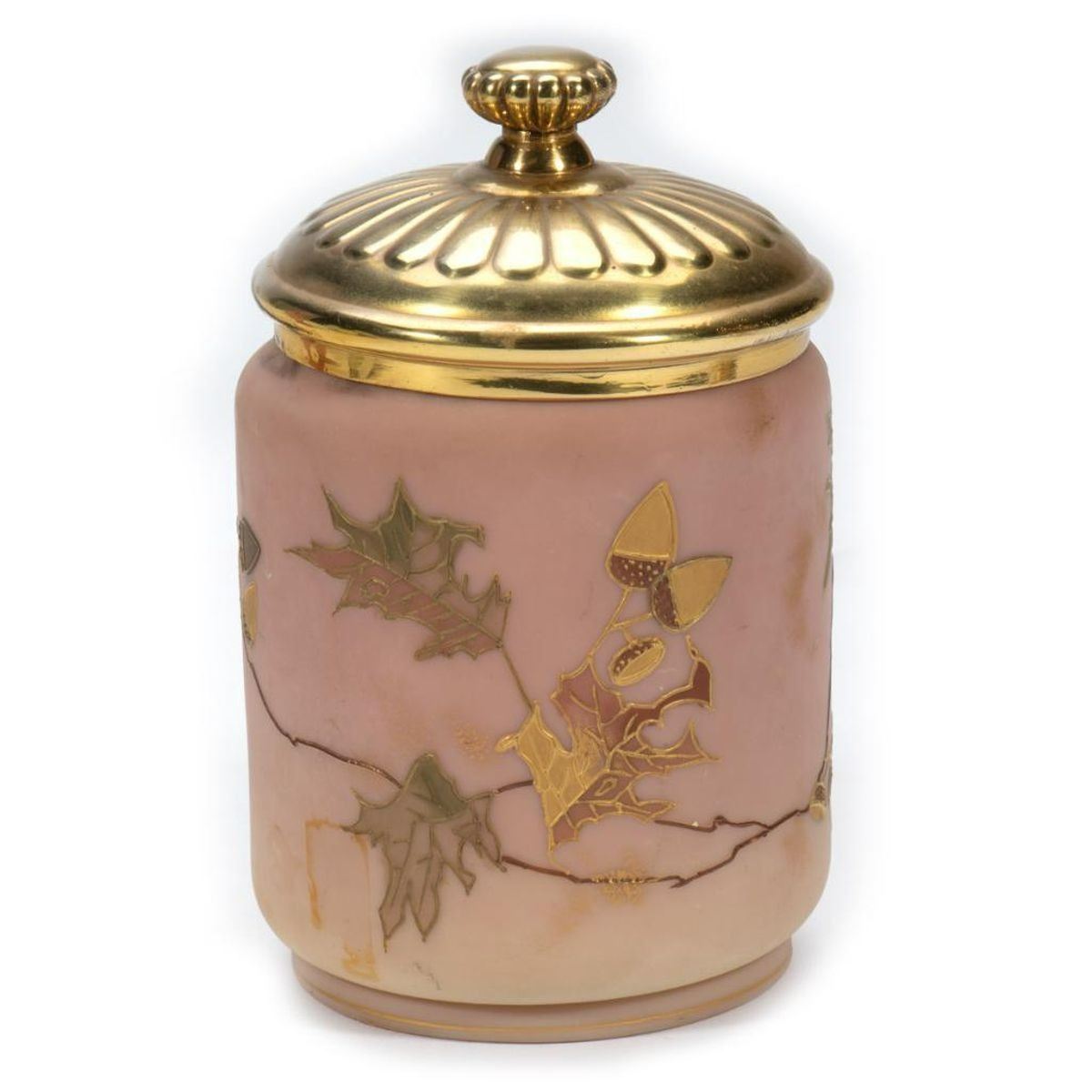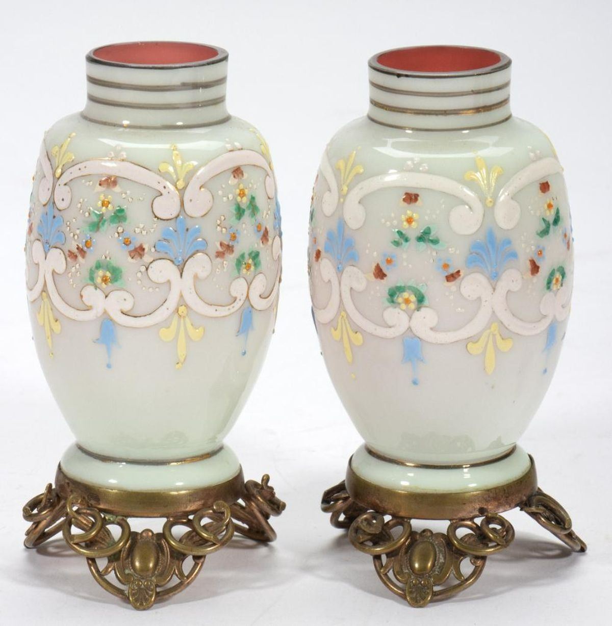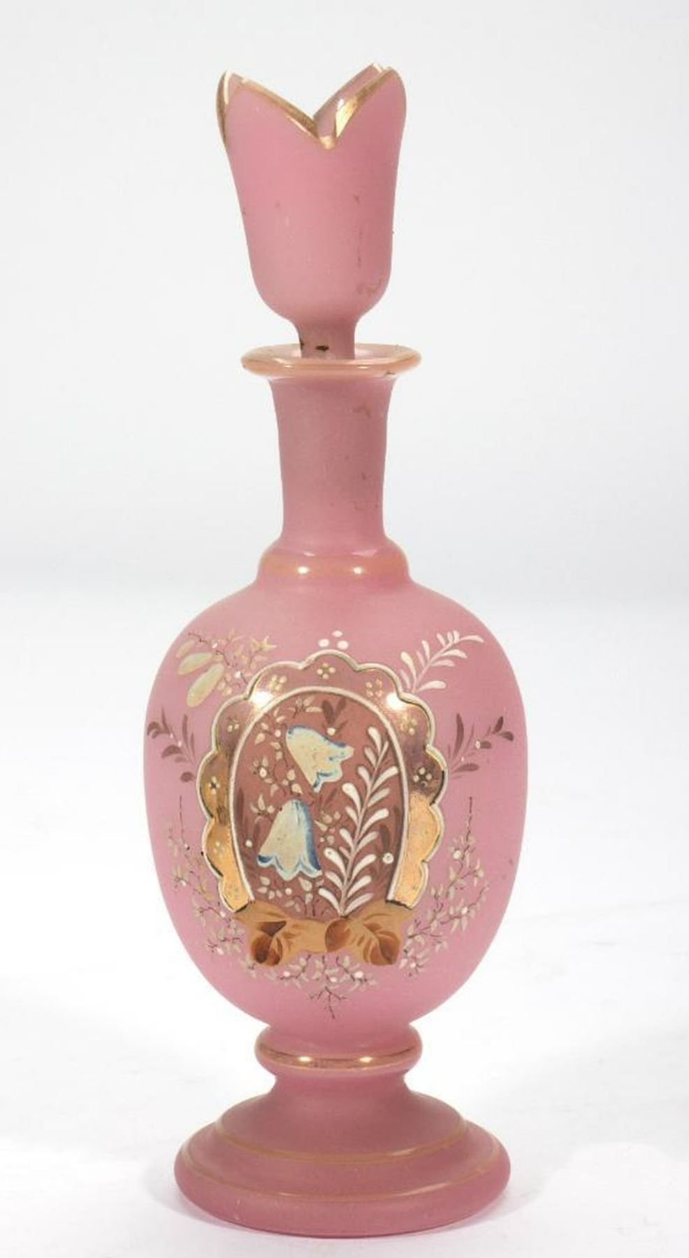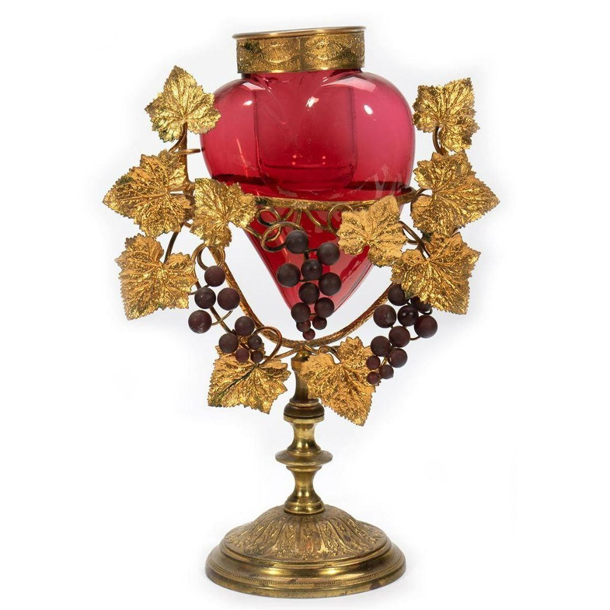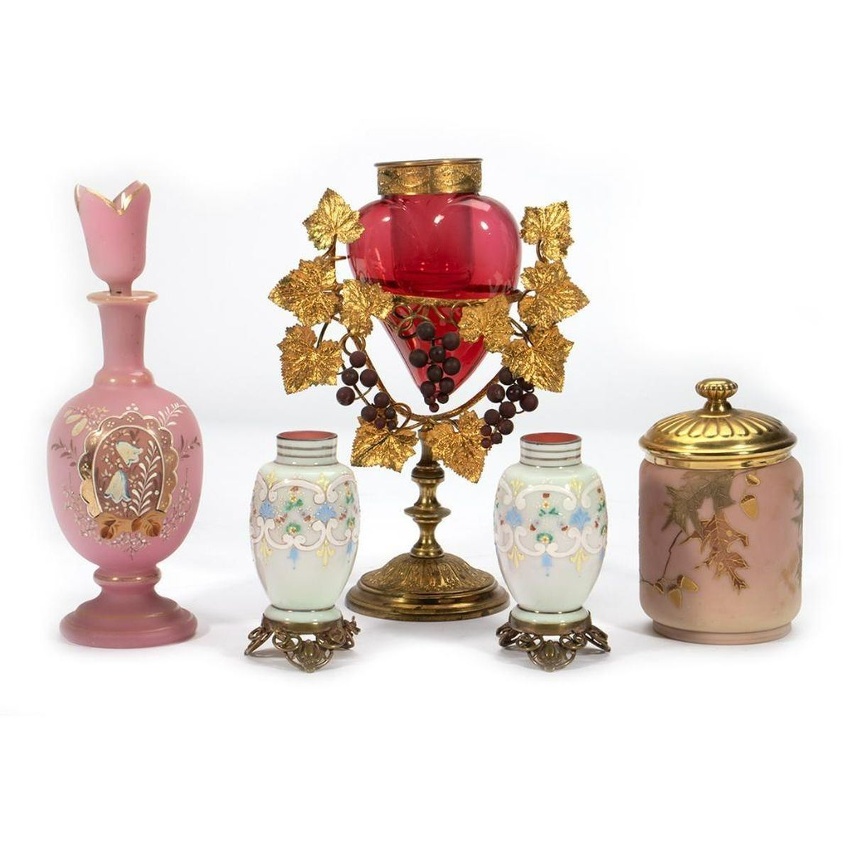 The heart-shaped vase has a clear glass cylindrical insert and sets inside a grapevine gilt-metal stand. Together with a pair of milk glass hand-painted vases on gilt-metal bases, a pink hand-painted lidded dresser jar, and a pink hand-painted decanter with stopper. Heart vase/stand: 10in. h. x 7 1/4in. w. Pair vases: 4 5/8in. h. Decanter: 10in. h. Condition: The insert in the heart vase has several cracks, otherwise all in good condition.