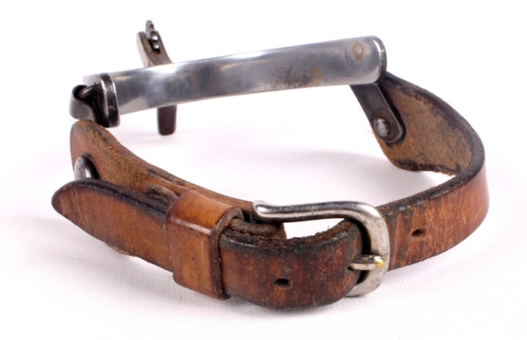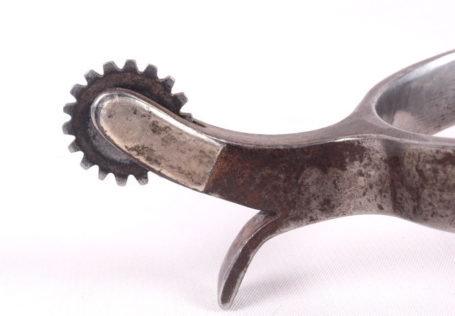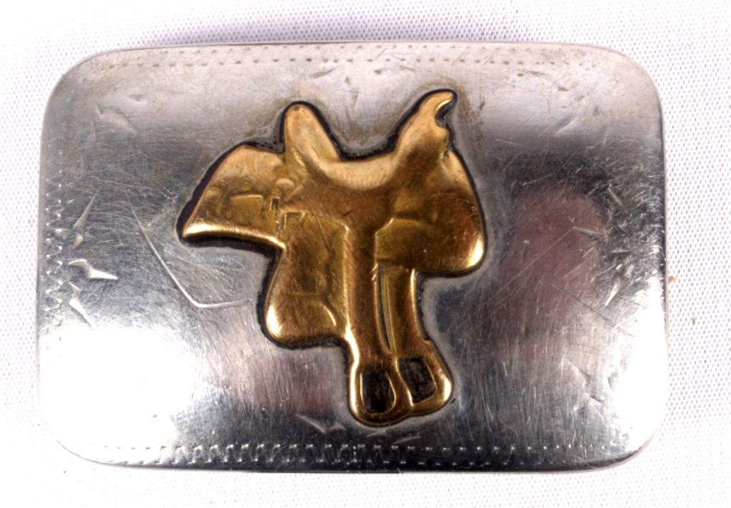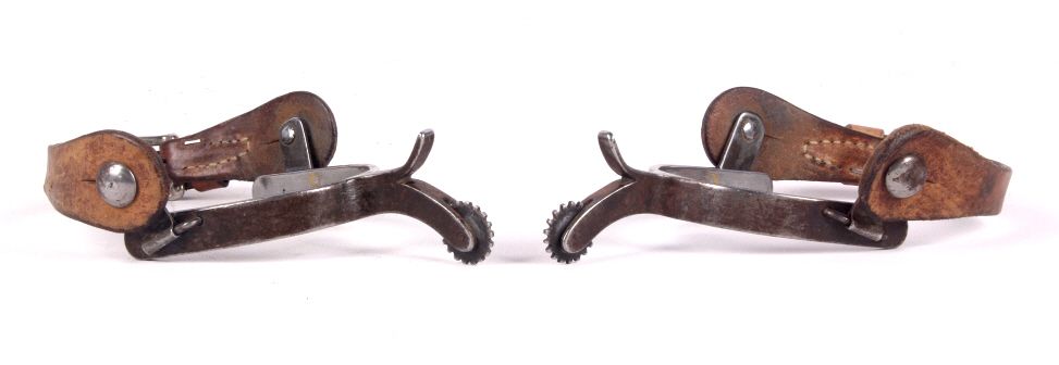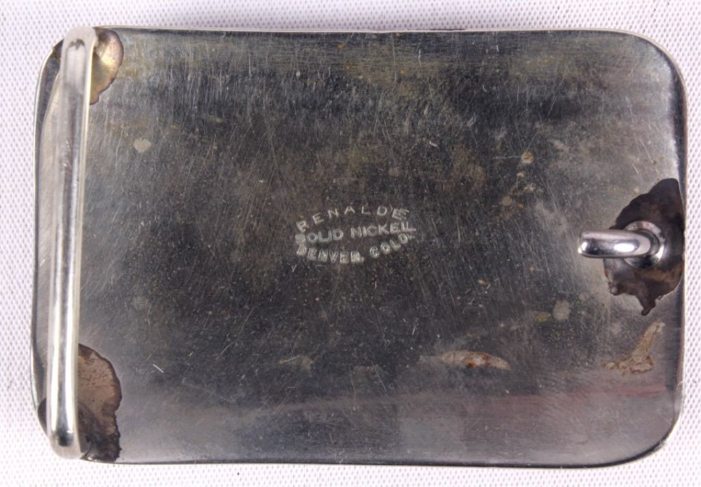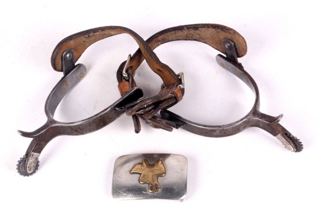 This lot features a Renalde belt buckle with a pair of spurs. The buckle is solid nickel and marked. The buckle is 1.75" x 2.75" and the spurs measure 3.25" x 5.25".