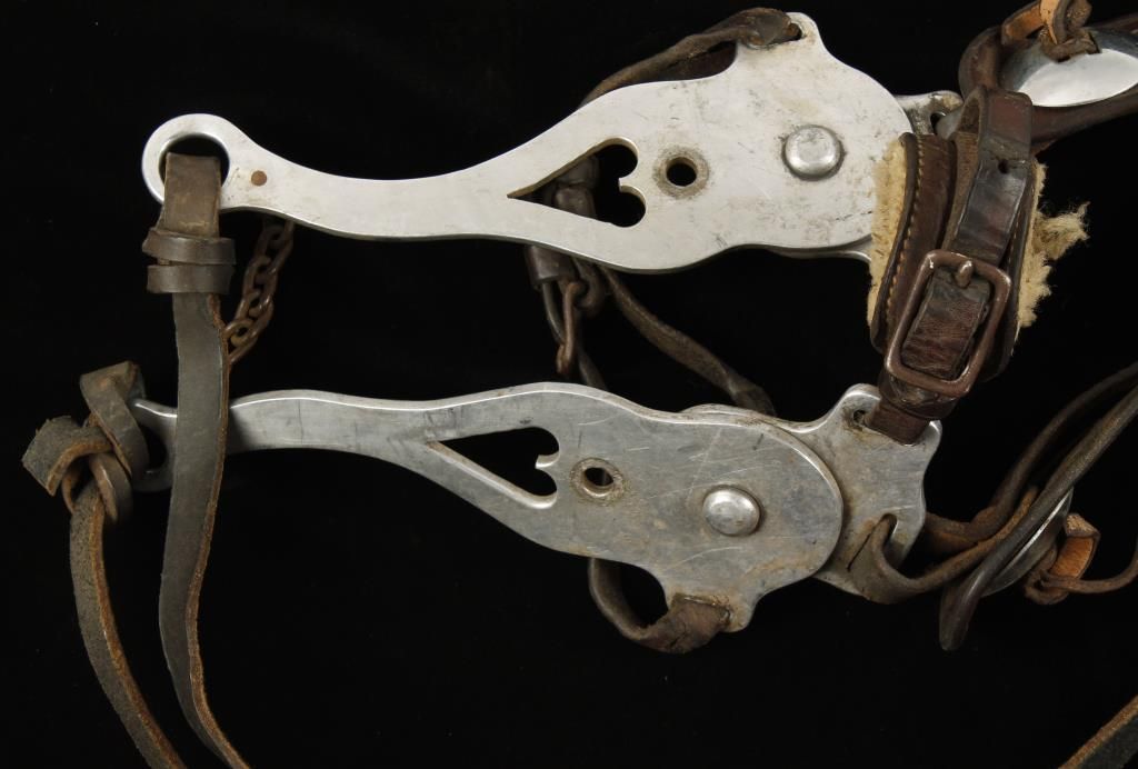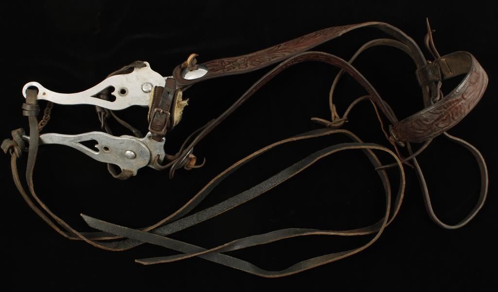 Aluminum construction with heart design with brown tooled leather headstall and reins. Appears to be unmarked. Overall fair condition. Leather appears to have some modification on one side.