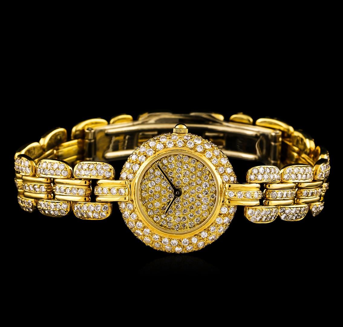 One ladies, Renato Ferraris wristwatch electronically tested 18KT yellow gold, Case, 24mm diameter, Case Back: engraved with the manufacturers name and logo, Bezel: diamond set, Crystal: synthetic sapphire, Movement: quartz. Dial: pave, set diamonds, Bracelet: 18KT yellow gold, flexible links, twelve millimeter width, set throughout with diamonds, Condition: G-5 Fine. Six and one half inch length. Concealed deployment clasp. Containing: Approximately Five Hundred Twenty Five pave, set round brilliant cut diamonds, approximate total weight = 4.00ct. Graded in the setting. Clarity: VS-1 to SI-2. Color: F - H. Total Weight of Diamonds 4.00ct. Total Weight of Watch 66.89 grams. AIG Appraised at $17,880.00.