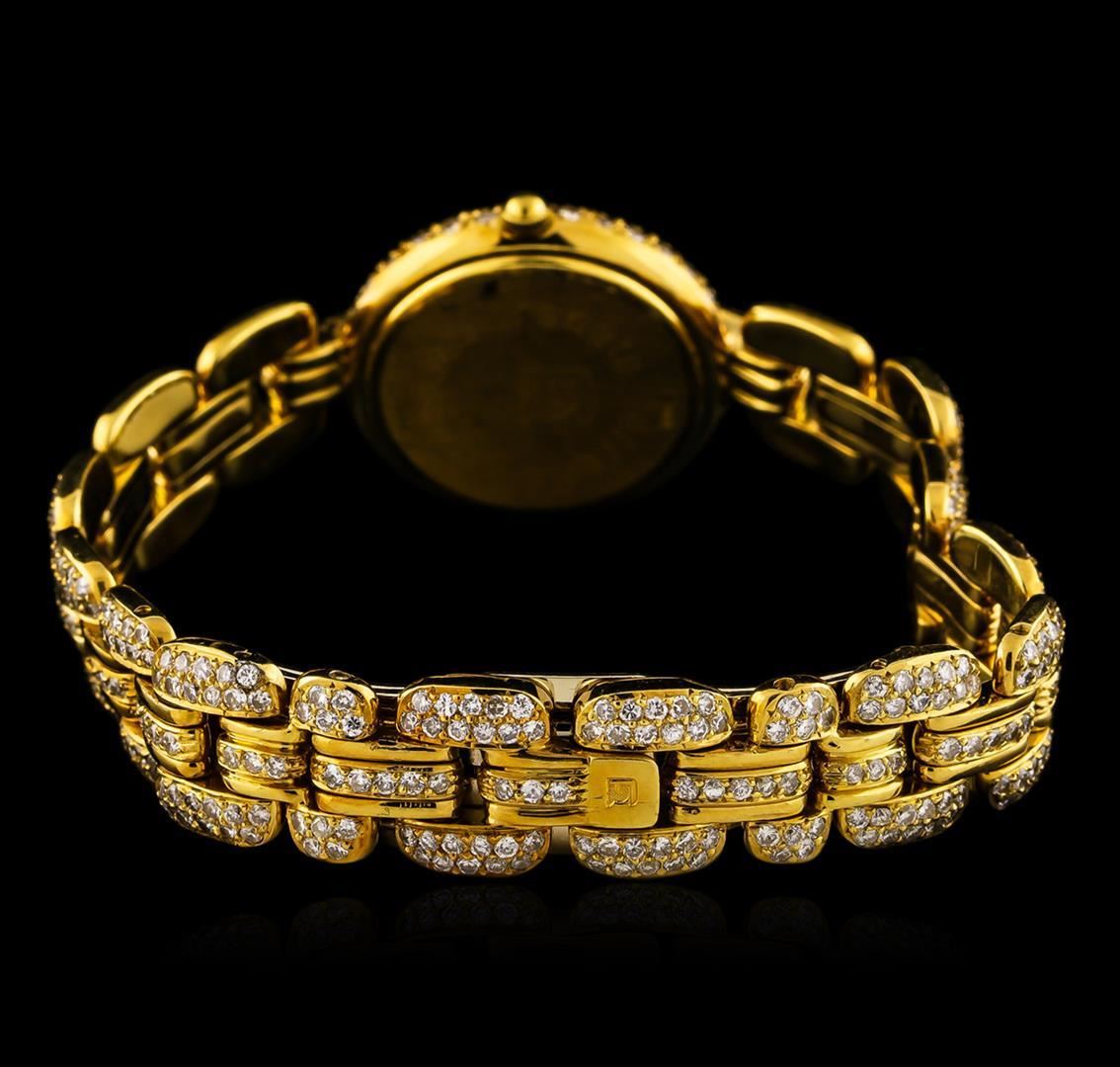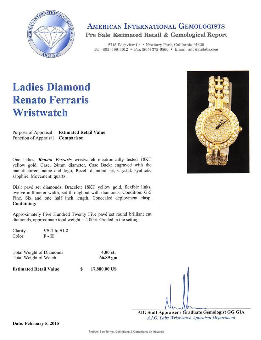 One ladies, Renato Ferraris wristwatch electronically tested 18KT yellow gold, Case, 24mm diameter, Case Back: engraved with the manufacturers name and logo, Bezel: diamond set, Crystal: synthetic sapphire, Movement: quartz. Dial: pave, set diamonds, Bracelet: 18KT yellow gold, flexible links, twelve millimeter width, set throughout with diamonds, Condition: G-5 Fine. Six and one half inch length. Concealed deployment clasp. Containing: Approximately Five Hundred Twenty Five pave, set round brilliant cut diamonds, approximate total weight = 4.00ct. Graded in the setting. Clarity: VS-1 to SI-2. Color: F - H. Total Weight of Diamonds 4.00ct. Total Weight of Watch 66.89 grams. AIG Appraised.