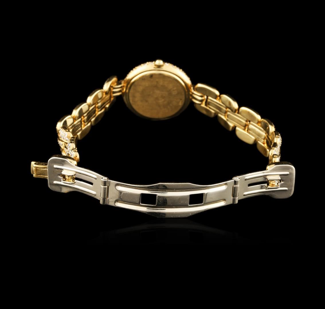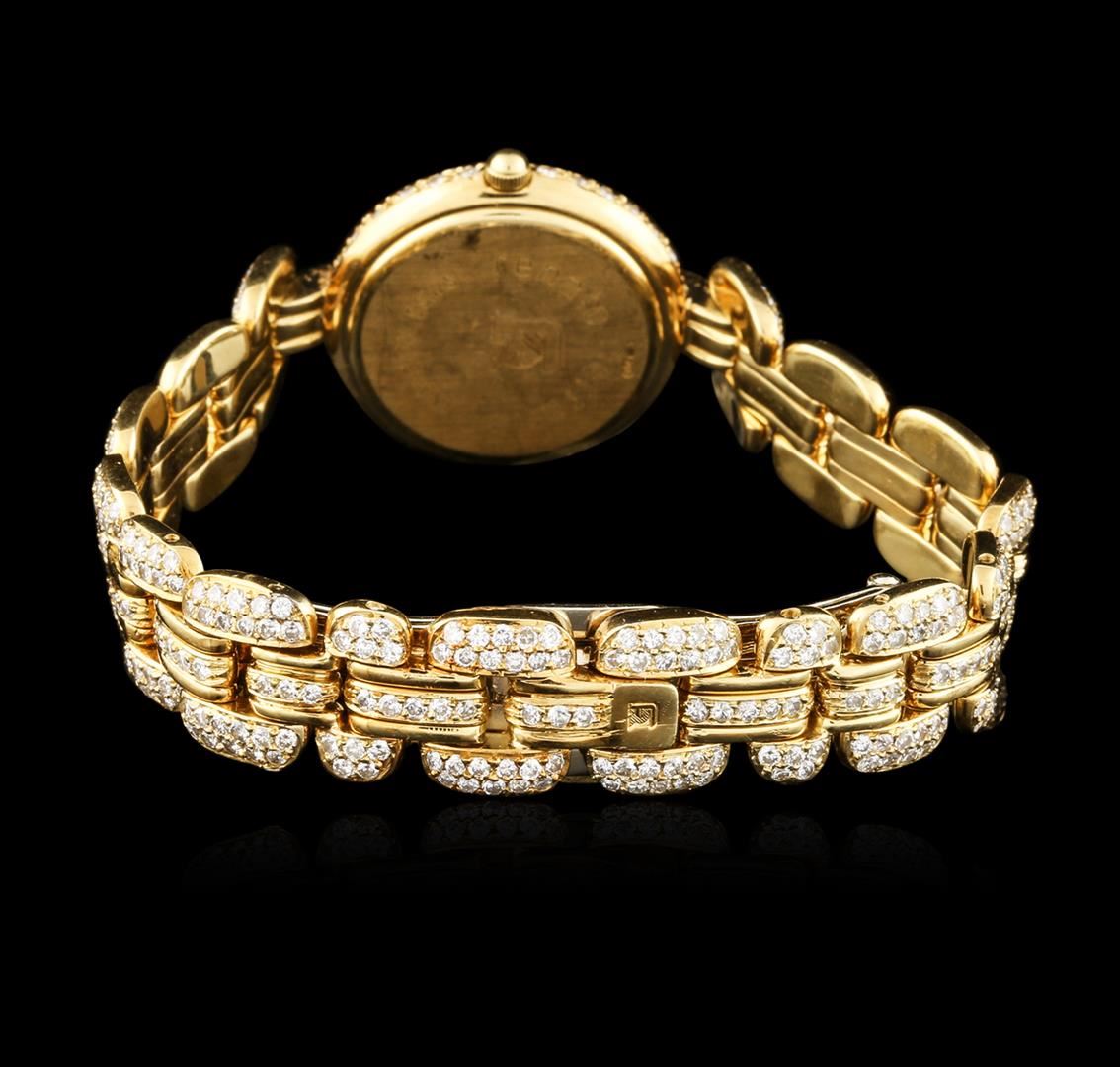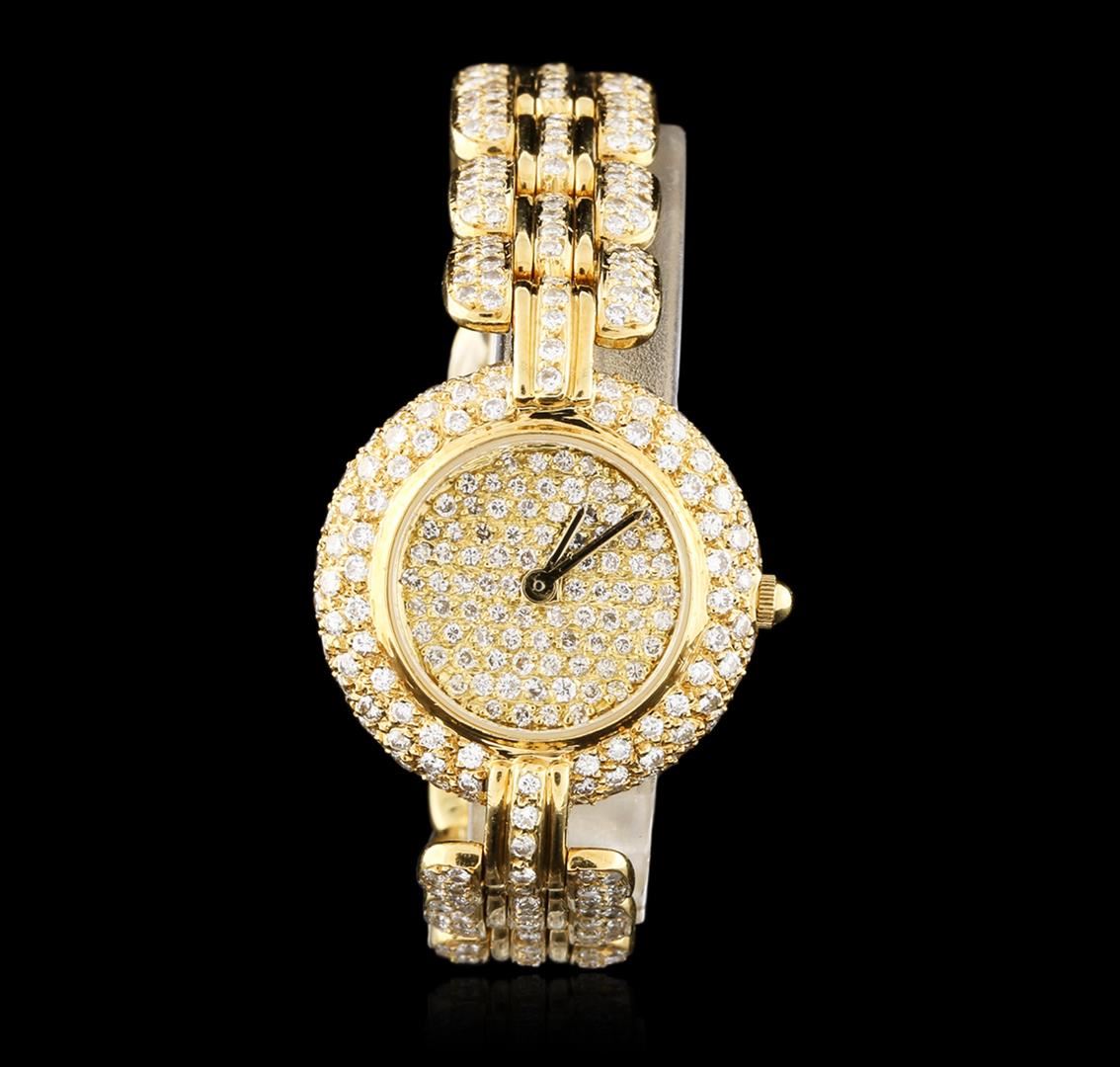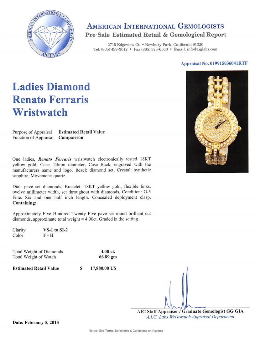One ladies, Renato Ferraris wristwatch electronically tested 18KT yellow gold, Case, 24mm diameter, Case Back: engraved with the manufacturers name and logo, Bezel: diamond set, Crystal: synthetic sapphire, Movement: quartz. Dial: pave, set diamonds, Bracelet: 18KT yellow gold, flexible links, twelve millimeter width, set throughout with diamonds, Condition: G-5 Fine. Six and one half inch length. Concealed deployment clasp. Containing: Approximately Five Hundred Twenty Five pave, set round brilliant cut diamonds, approximate total weight = 4.00ct. Graded in the setting. Clarity: VS-1 to SI-2. Color: F - H. Total Weight of Diamonds 4.00ct. Total Weight of Watch 66.89 grams. AIG Appraised at $17,880.00.