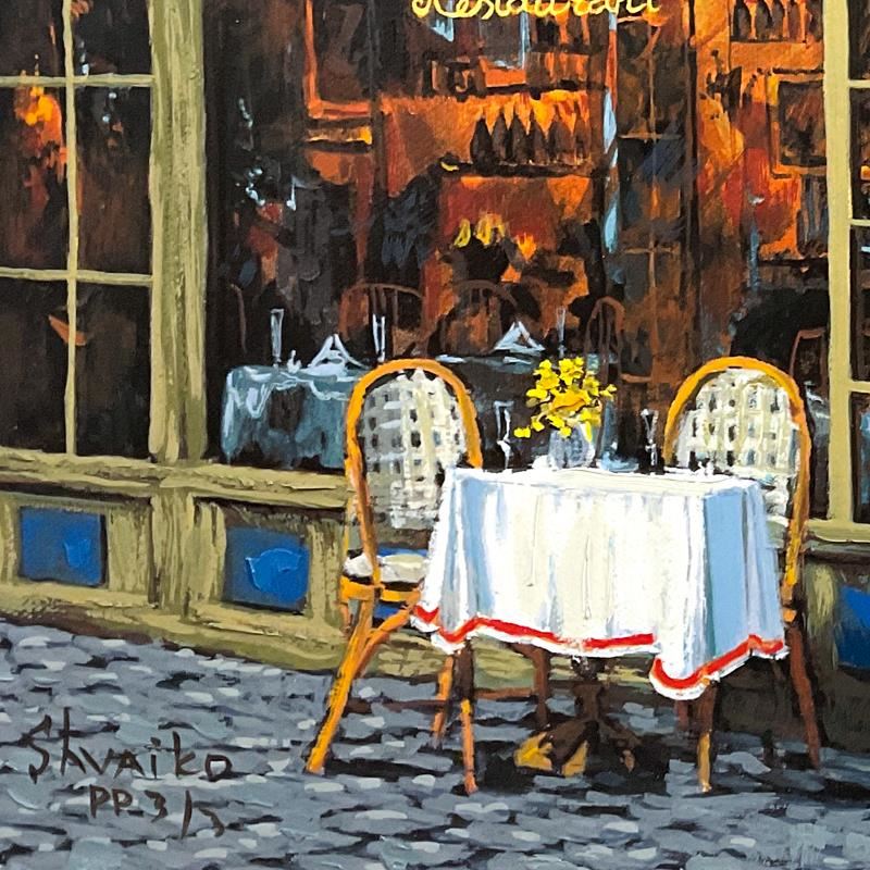 "Rendezvous" is a hand embellished limited edition printer's proof on stretched canvas by Viktor Shvaiko, numbered 3/3 and hand signed by the artist. Includes Letter of Authenticity. Measures approx. 12" x 16" (image). There is minor wear on the corners and edges that will be concealed when framed.