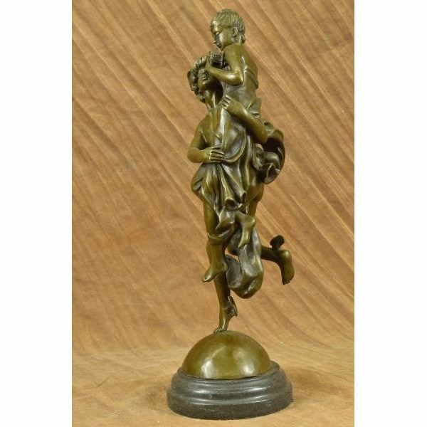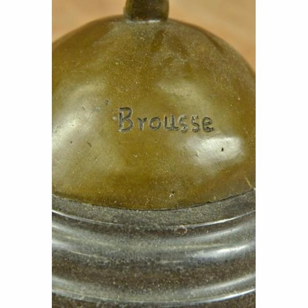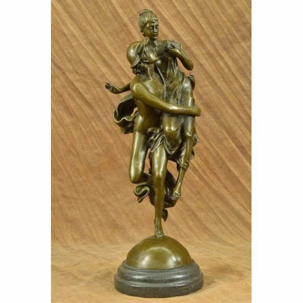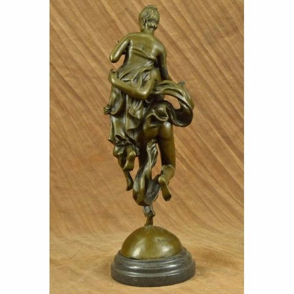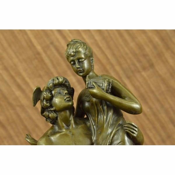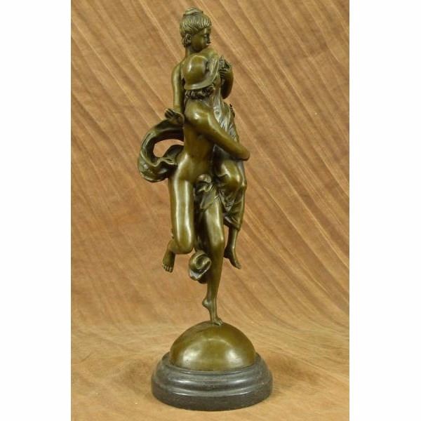 This is an exquisitely detailed hot cast bronze sculpture rendition of hermes/mercury and pandora.The remarkable sculpture of two figures are balanced practically on mercury’s toes achieved by solid casting mercury’s foot and toes as part of the base and joining them, as a unit at his thigh. Assorted mythological tales describe the aura of pandora. Pandora was the image of a perfect, beautiful woman. It is believed that zeus appointed hephaestus to create her. She was formed from earth and water and arose from the earth, inanimate and naked - a perfect parthenos. pandora was then adorned with gifts from all of the gods, clothed in gold, jewels, and elaborate garments. Pandora was sent to earth flown by Hermes/Mercury with a box, named pandora’s box, and given to epimetheus as a wife. Pandora was sent to punish the human race because Prometheus gave them the gift of fire that was stolen from the gods. Before Pandora there was no evil, no sickness or death and no labor. The world was perfect. Pandora's box is the vessel she brought to earth. It contained all of the evils which she released onto humanity, leaving only hope behind. This rendition was cast using the age-old technique of lost-wax casting and finished with a brown patina stain. It stands communicating the fables and messages of the antiquated gods upon a black marble base with the artist's signature Brousse. Condition: This sculpture is in perfect condition. Bronze Dimensions with Marble Base:Height 17" x Width 7" Marble Dimensions: Diameter 6" Height without base: 16" Weight : 12 LBS Inventory : 25STE3549752
