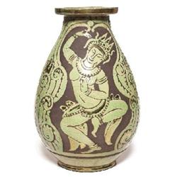 Exceptional Rene Buthaud vase, bulbous form with a sandstone finish under an iridescent green "indochinois" decoration, signed J.Doris (pseudonym), 12.5”h, well done