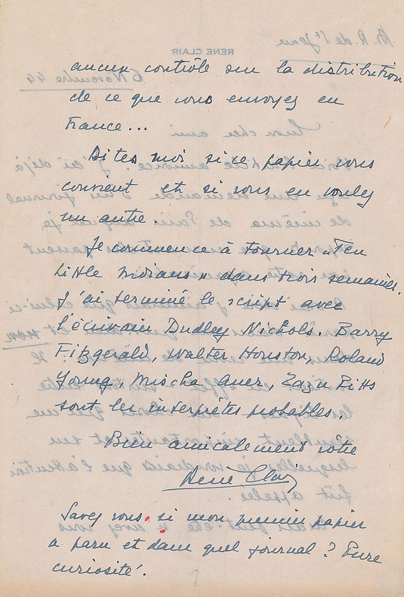 French director (1898–1981) best known for such films as À nous la liberté and The Ghost Goes West. ALS in French, one page both sides, 6.25 x 9.25, personal letterhead, November 6, 1966. Untranslated letter to a friend. In fine condition, with central vertical and horizontal folds and toning to lower edge.