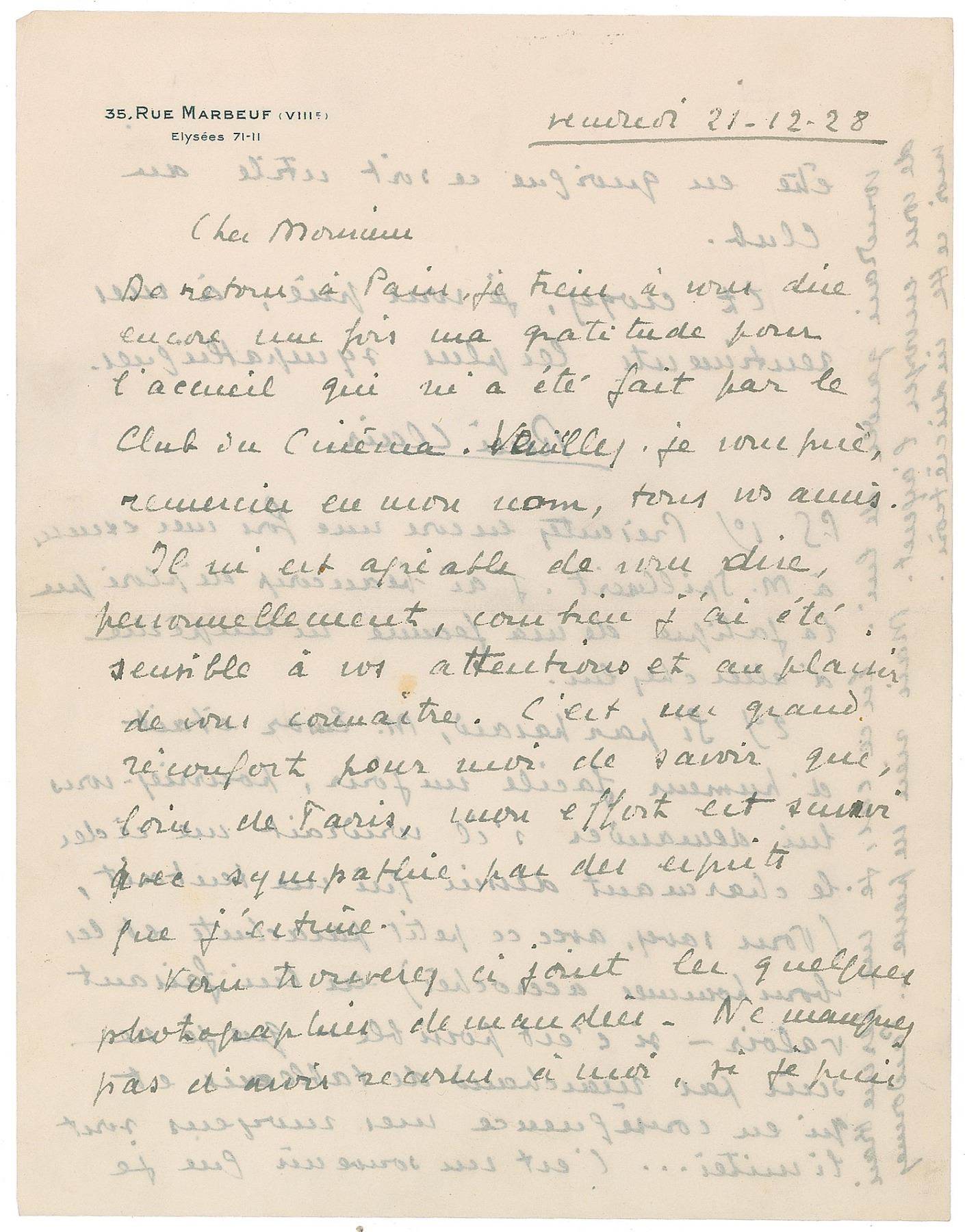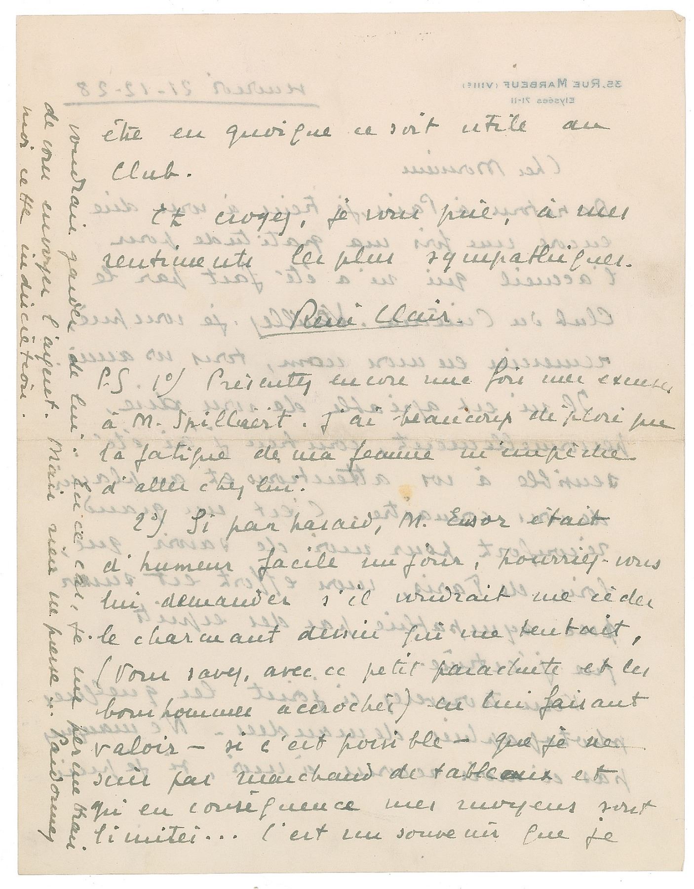 French director (1898–1981) best known for such films as À nous la liberté and The Ghost Goes West. ALS, one page both sides, 8.25 x 10.75, personal letterhead, December 21, 1928. Letter to Belgian author, filmmaker and documentarist Henri Storck. Back from a trip to Belgium, he thanks Storck for the friendly reception at the Club du Cinéma, attaching some photographs. In one of the postscripts, he asks Storck to help him obtain a drawing from noted artist James Ensor (translated): "Back in Paris, I would like to once again express my gratitude for the welcome I received from the Club du Cinema…It is a great comfort for me to know that, far from Paris, my efforts are followed with sympathy by the spirits that I esteem. You will find attached the few photographs requested…Once again apologize to Mr. Spilliaert, I have much regretted that the fatigue of my wife prevents him from going home…If by chance, Mr. Ensor is in an easy mood one day, could you ask him if he would like to give me the charming drawing that tempted me (you know, with this little parachute and the hitched men)." In fine condition, with some light creasing.