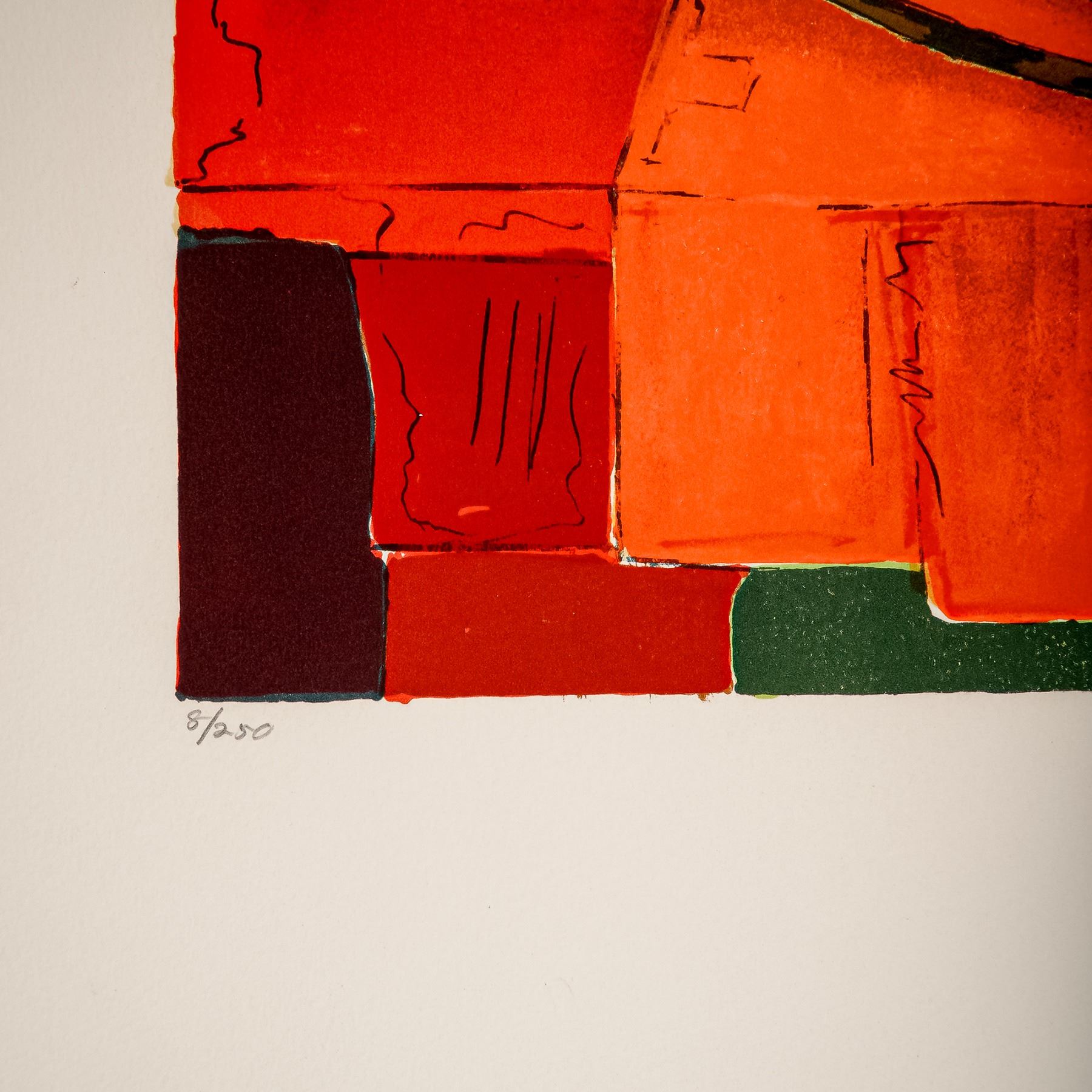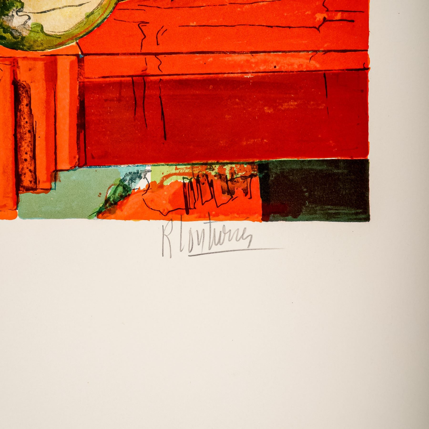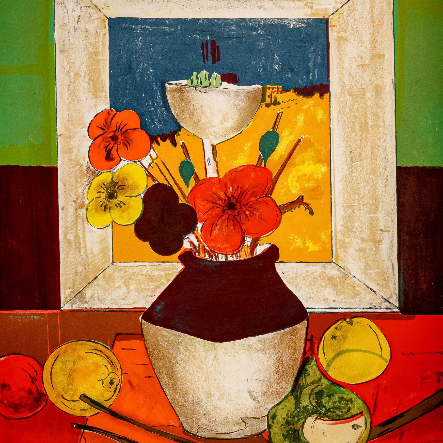 A compelling limited edition lithograph by French artist Rene Couturier, titled Still Life with Poppies. This work captures Couturier's mastery of bold color and modern composition. The piece juxtaposes a vivid arrangement of poppies with rich geometric backgrounds, creating an engaging dialogue between traditional still life and contemporary abstraction. Couturier, known for his avant-garde interpretations and collaborations with major cultural figures, remains celebrated for his inventive approach to 20th-century art. This lithograph exemplifies his dynamic use of line and vibrant palette, making it a captivating addition to any fine art collection. Numbered 8/250 and hand signed by the artist.