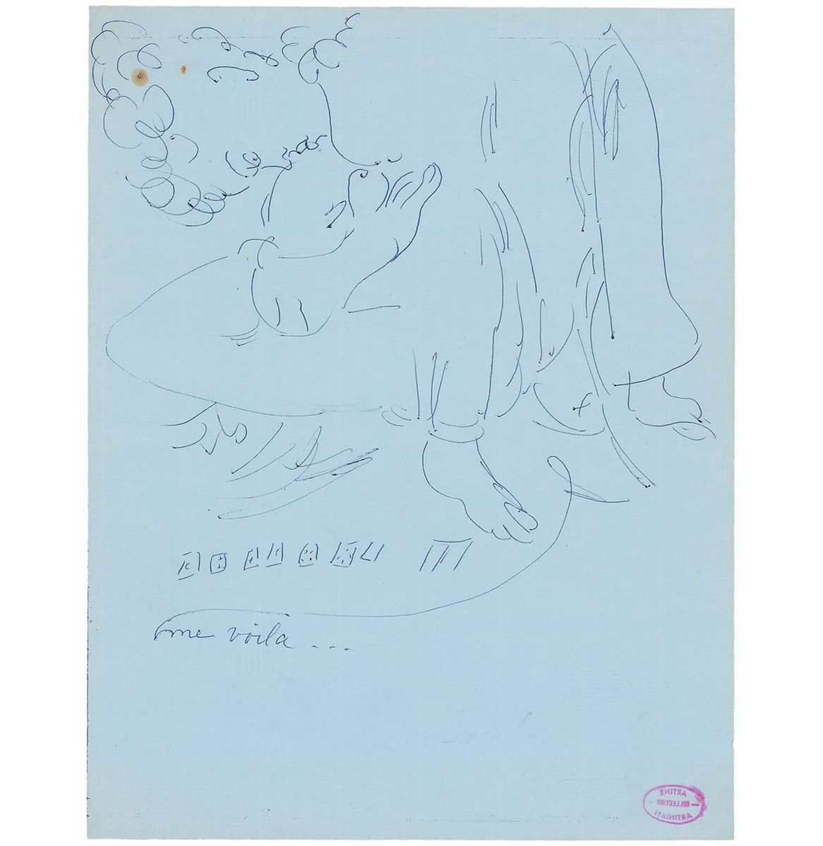 Important early French surrealist author (1900–1935) who committed suicide at age 35. Wonderful ballpoint sketch on a 8.25 x 10.5 sheet showing a crouching figure playing dominoes, unsigned but with “Me voila” written below the drawing. The sheet also bears a Artine Artinian Collection provenance stamp to the lower right. In fine condition, with rusty staple holes to upper left. An exceedingly scarce, magnificent sketch.
