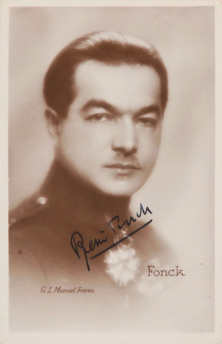 French aviator who ended the World War I as the top Allied fighter ace (1894–1953). Scarce matte-finish 3.5 x 5.5 postcard photo of Fonck by G. L. Manuel Freres, boldly signed in fountain pen. In fine condition. Pre-certified PSA/DNA.