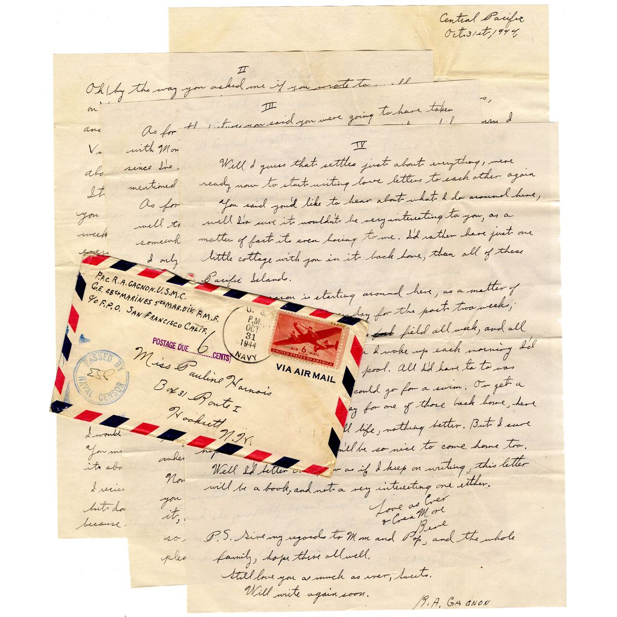 Rene Gagnon WWII autograph letter signed five times as a Private First Class in the US Marine Corps. Gagnon was one of the six soldiers pictured in ''Raising The Flag on Iwo Jima'', the iconic image of the turning point of the war and one of the most famous photographs of all time. From an undisclosed location in the ''Central Pacific'', he writes to his sweetheart and future wife Pauline Harnois. Dated 31 October 1944, letter reads, [uncorrected for minor errors] in part, ''...I was out in the field...I'm back in camp...Please don't worry too much when the letters don't come regularly, as sometimes we go out in the field for weeks at a time, and I can't write...About the souvenirs you asked for well if I find anything around here that hasn't got the name of this place stamped on it, I'll send it to you, as you know, we can't send anything with the trademark on it, as it would disclose where we are...R.A. Gagnon...air mail goes faster than Vmail; Air mail takes about 6 days and Vmail takes about 8. It doesn't matter much though, except that you can write more on air mail letters...You said I didn't have faight in you, well if you don't think so, what am I doing out here...rainy season is starting around here...Last week we went out in the field...all we had was pup tents, when I woke up each morning I'd have an indoor swimming pool...Swell life, nothing better. But I sure hope it ends soon...Rene...'' Accompanied by the censor-stamped mailing envelope made out in Gagnon's hand in ink, including his name and return address. 4pp. letter in ink on 4 sheets of plain stationery measures 8.5'' x 11''. He adds ''R.A. Gagnon'' to the bottom edge of every sheet, totaling 5 signatures plus envelope. Toning and creasing, else near fine.
