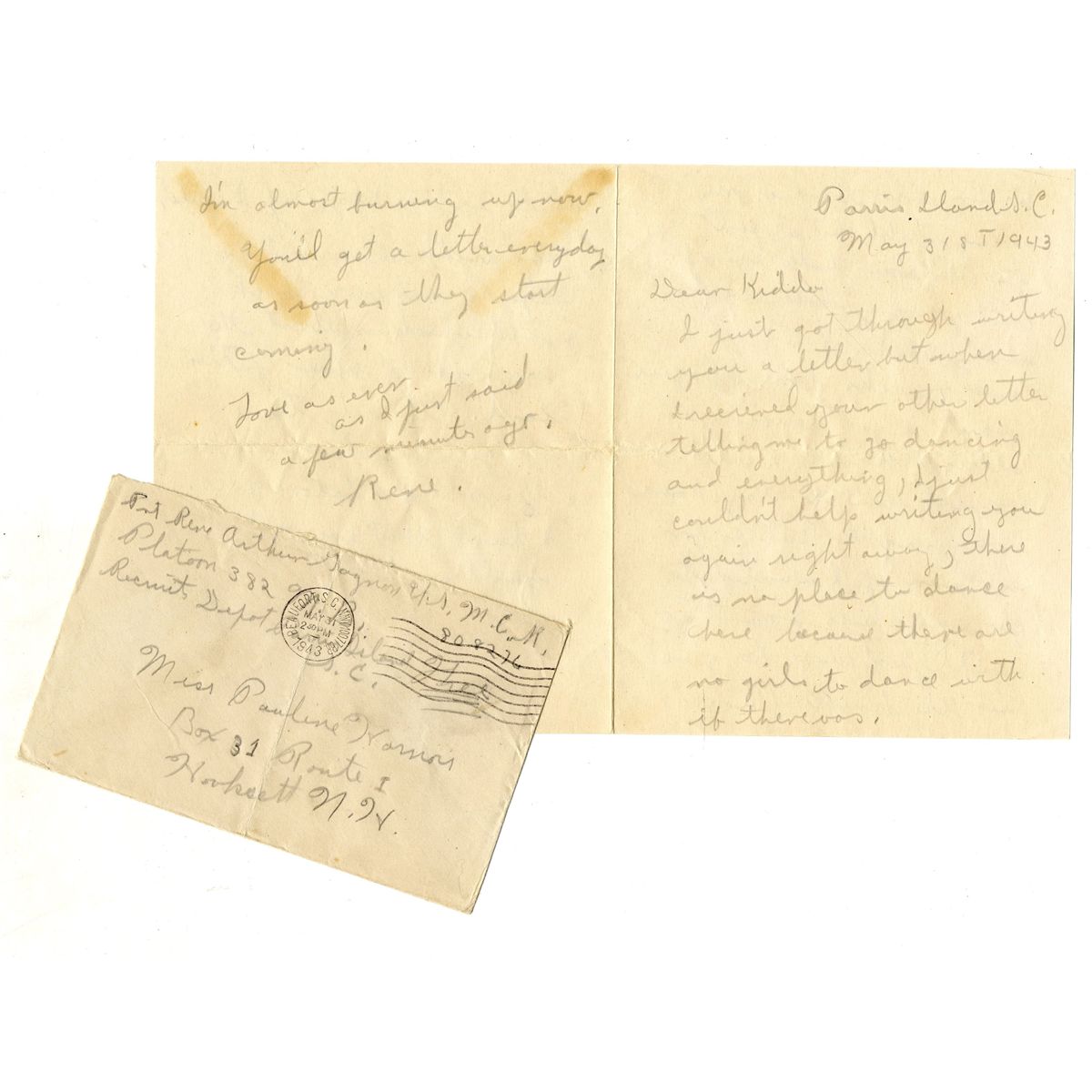 WWII Iwo Jima hero Rene Gagnon autograph letter signed as a Private First Class in the US Marine Corps, datelined 31 May 1943 from training camp on Parris Island, South Carolina. Gagnon was one of the six WWII soldiers elevated to icon status after appearing in the famous photograph ''Raising The Flag on Iwo Jima.'' Love letter is addressed to his sweetheart back home, Pauline Harnois, and discusses daily camp life. Reads in part: ''...there is no place to dance here because there are no girls to dance with...as for shows there is one every night but we can't go. The truth is we can't go anywhere right now, not until we get our 7 weeks done...As to where I'd go if I could, the truth is we can't go outside our own back yard which is about the size of your father's land. The only time we somewhere is when the whole platoon goes...'' Signed ''Rene''. Written in pencil, card-style letter runs 4pp. with writing on each side of card. Minor toning and horizontal fold from mailing, else very good. Includes original postmarked Navy Yard stamped envelope with return address and Gagnon's full name written in his hand. Very good overall.