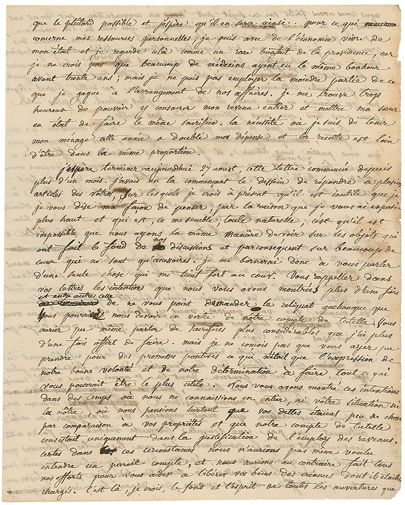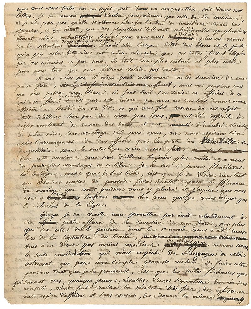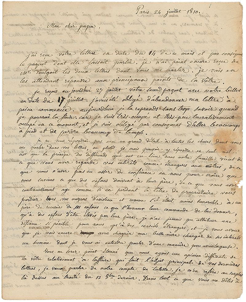 French physician (1781–1826) who invented the stethoscope in 1816 and pioneered its use for diagnosing chest problems. Partial autograph letter, unsigned, in French, four pages on two adjoining sheets, 7.75 x 9.75, July 24, 1810. First four pages to a longer letter to his father Teophile Laennec about financial matters and the country home his father bought, Kerlouranec, with several crossed out corrections by Laennec. In fine condition, with intersecting folds and some scattered light areas of toning.