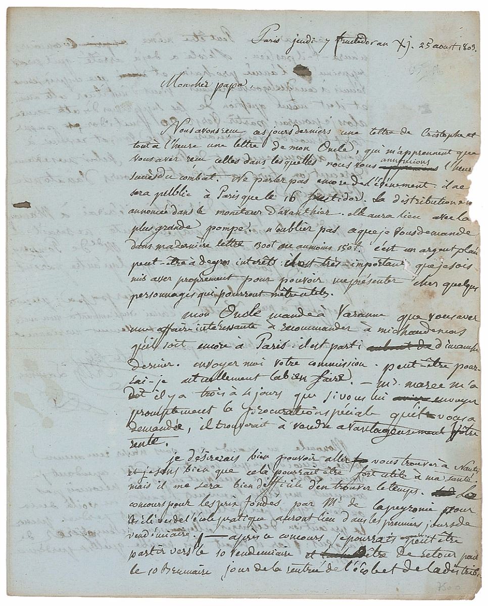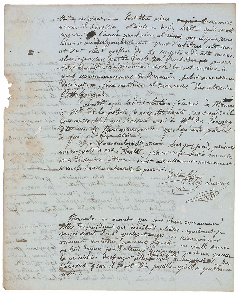 Upon entering the École Pratique in Paris at the turn of the century, Rene Laennec immediately thrived as a student; publishing his first major scientific paper in 1802, describing a series of six cases of peritonitis (now considered the first description of this disease entity), he was recognized by the medical community as a leading scholar in the nature of disease before even receiving his diploma. The following year, he was awarded the school’s first prizes in both medicine and surgery. Sharing the news with his father just days after the event was announced in the Monitor, the official government newspaper, he stresses the importance of looking the part, “so that I can introduce myself to various persons who could be useful to me.” With such key figures as Minister of the Interior Jean-Antoine Chaptal, who presented the awards, and François Gigot de la Peyronie, the famed surgeon of both Louis XIV and Louis XV, the event held major networking opportunities. Balancing the heavy load of his studies with his own fragile health—constant respiratory difficulties, which he typically relieved by visiting Nantes for its rejuvenating fresh air—this is an extraordinary letter from the start of Laennec’s distinguished career.