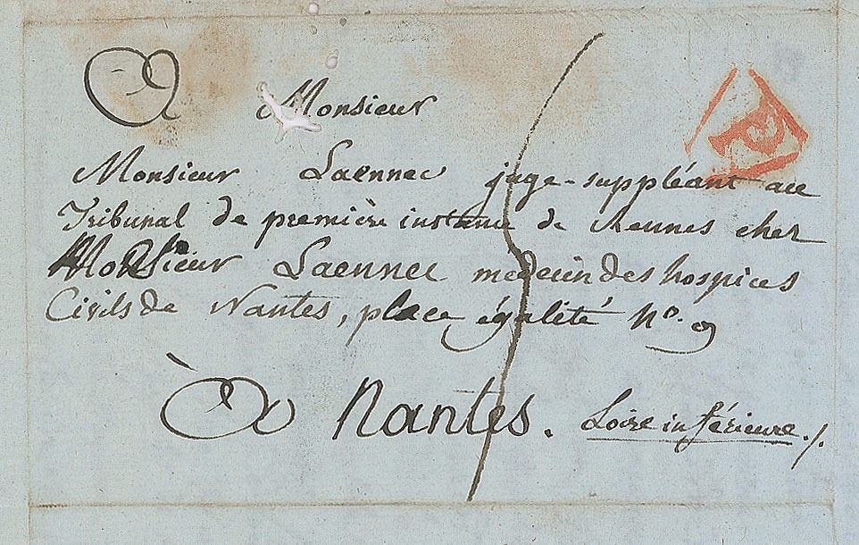 I would like very much to go to Nantes to see you because that would be of great benefit to my health. But it will be difficult to find the time because the Competition for the prizes established by M. de Lapeyronie for students of the Ecole Pratique will take place at the beginning of vendemiaire [late September]. I could return to Paris at the beginning of brumaire [late October] and take my introductory examinations, do my thesis, and my course in anatomical pathology.” Reverse of second integral page, trimmed to a size of 7.5 x 6, bears an address panel in Laennec’s hand which retains most of its red wax seal. In very good to fine condition, with intersecting folds, a couple small spots of ink erosion and paper loss to edge (not affecting legibility), and some scattered mild toning.