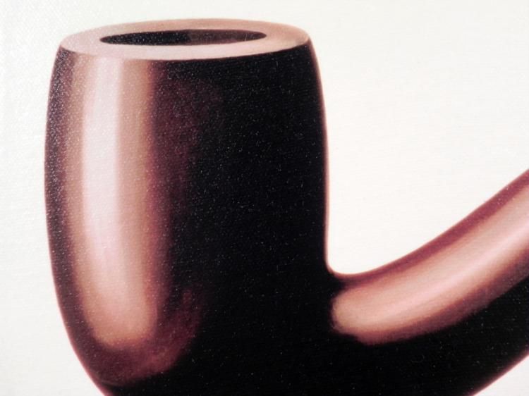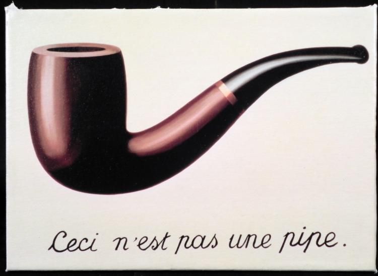 If this is not a pipe, then what is it, a device to smoke tobacco?? * * * Title: "Ceci n'est pas une pipe" (This is not a pipe) * * Artist: Rene Magritte * * Medium: unsigned offset lithograph print transferred onto canvas: stretched on boardSize: 11 1/2" x 8 1/4"Condition: Excellent * Biography: * * Rene Magritte (1898 – 1967) was a groundbreaking Surrealist who combined wit and illusion. Magritte, who originally designed wallpaper, posters and ads, began painting full time after receiving a gallery contract. In Magritte’s signature style, he places * ordinary objects in unexpected contexts, often blocked faces with floating objects to challenge preconceptions about the unknown. Despite harsh initial criticism of his work, he became one of the world’s most significant artists. Public awareness of Magritte * escalated when his art was featured on 1960’s album covers, and it still remains provocative and highly influential. * * Found from: http://www.allposters.com/-sp/La-Trahison-des-Images-Posters_i7403830_.htm