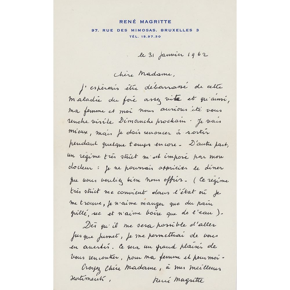 Belgian artist (1898–1967) best known for his paintings in a surrealist, humor-tinged style, often incorporating such trademark elements as bowler hat-wearing men, windows, eyes, and female torsos. ALS in French, one page, 5.25 x 8.5, personal letterhead, January 31, 1962. Untranslated handwritten letter by Magritte. In fine condition.