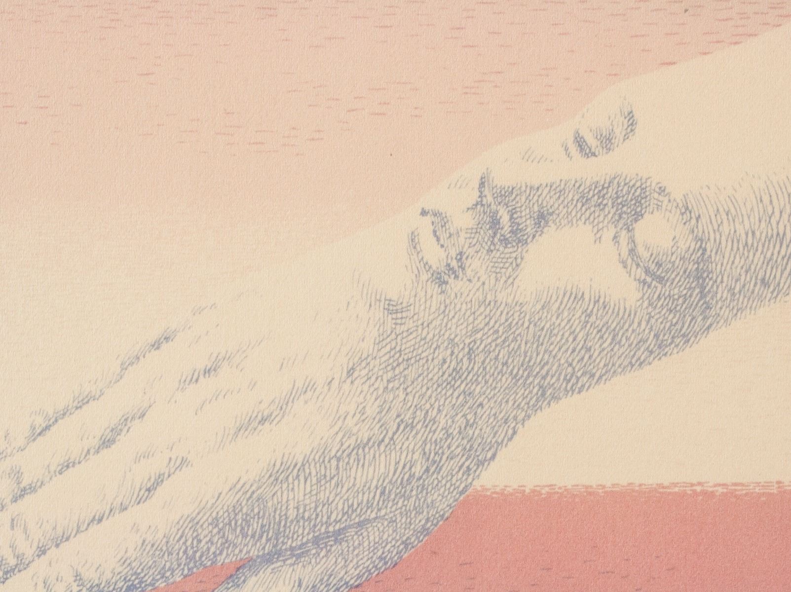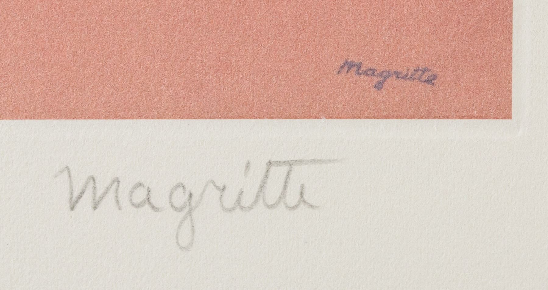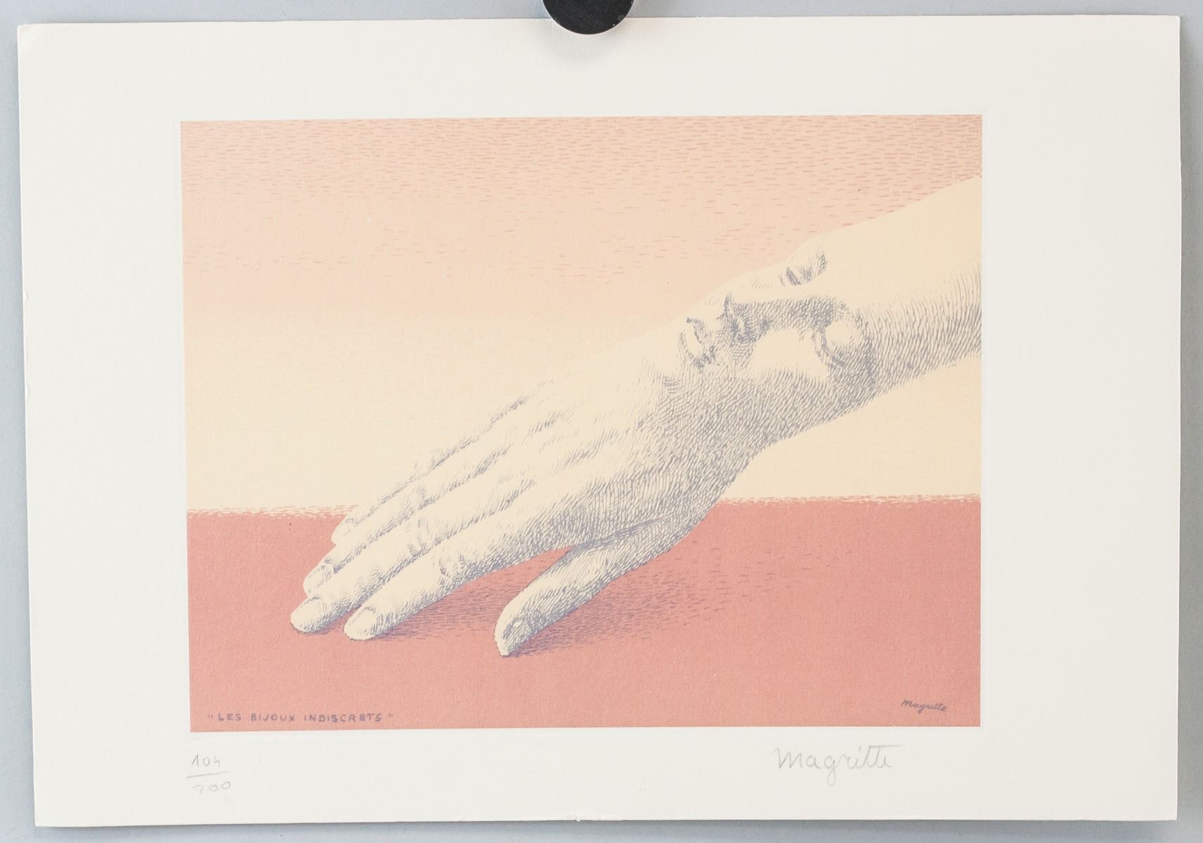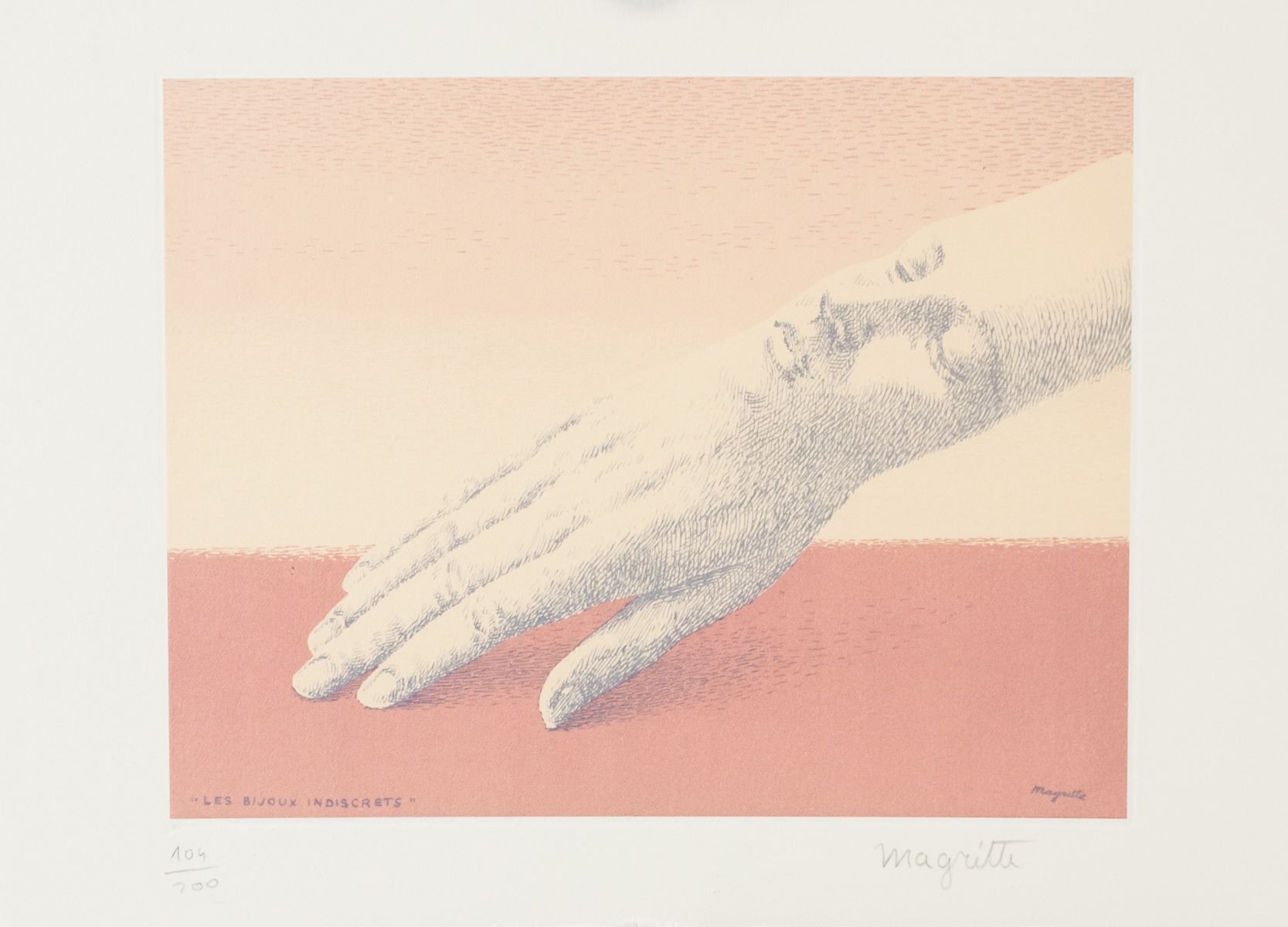 Lithograph on paper. Featuring surrealist composition of a right hand reaching toward the ground. A face can been seen on the back of the wrist. Signed "magritte" to the bottom right. Numbered "104/200" to the bottom left. Attributed to Rene Magritte (1898-1967, Belgian). Plate: 16 x 21 cm (6.5 x 8.25 in), Sheet: 21 x 30 cm(8.3 x 12 in).