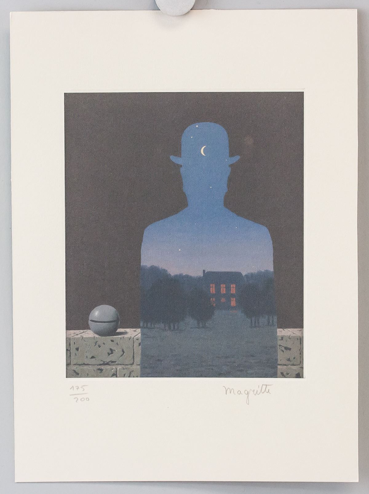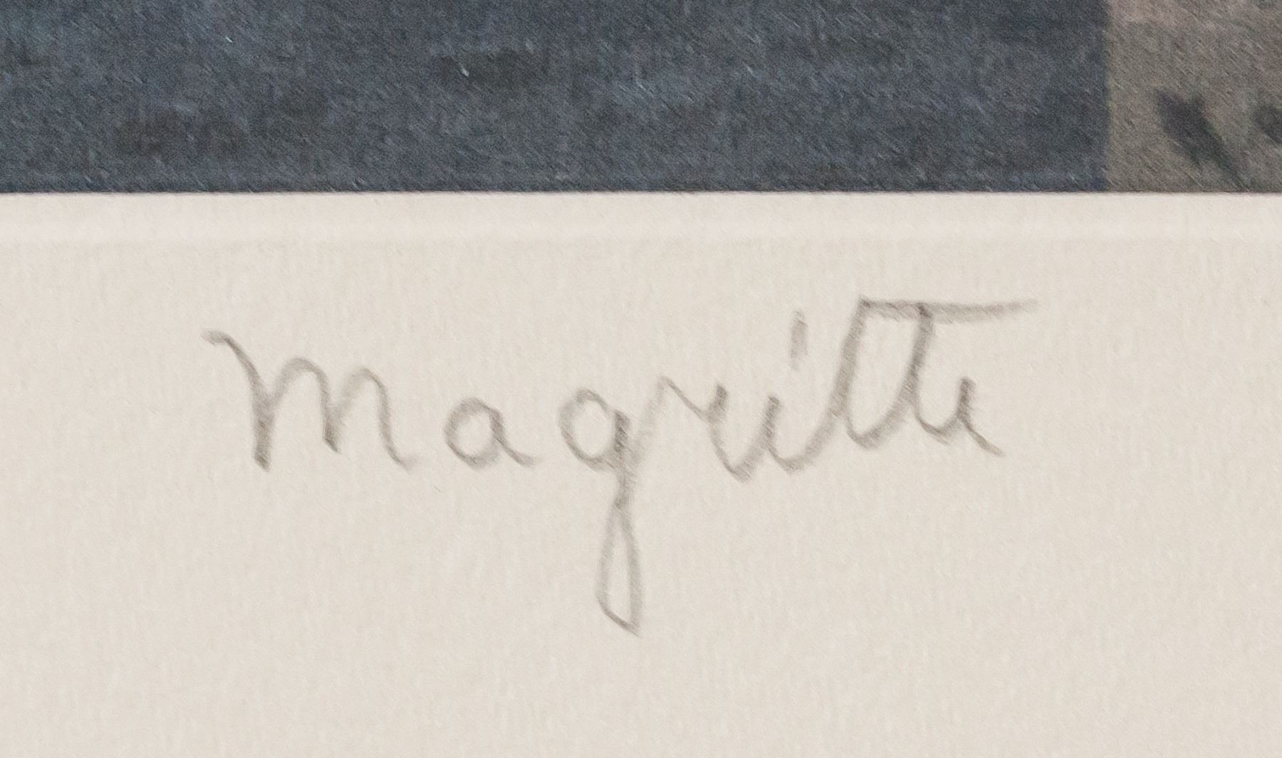 Linocut on paper. Featuring a silhoutte of a man in a bowler hat. Signed Magritte and inscribed in pencil 175/200 on the lower right and lower left corner, respectively. Attributed to Rene Magritte (1898-1967, Belgian). Plate size: 18 x 15 cm (7 x 6 inches). Paper size: 29 x 21 cm (11 x 8.25 inches). Provenance: This lot carries limited provenance from a Southern Ontario estate