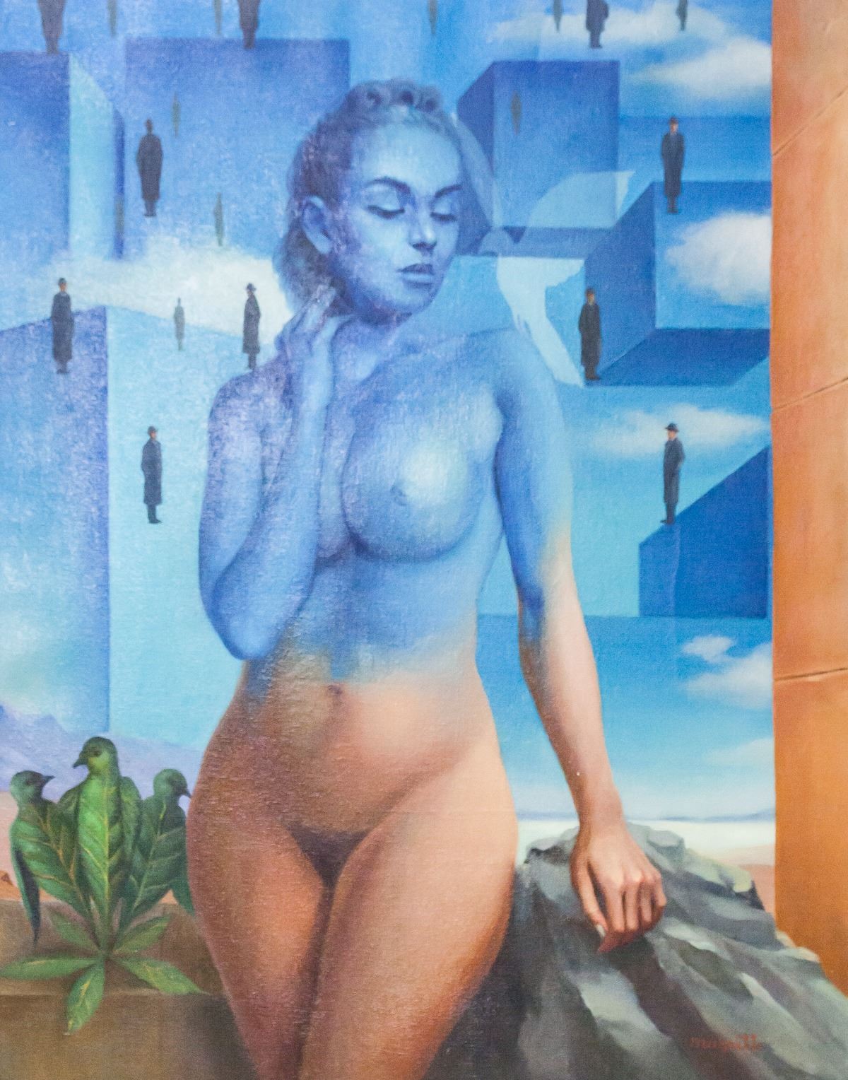 Oil on canvas, framed. Featuring surrealist composition of a nude woman with her torso in blue. Signed "magritte" in the bottom right corner. Label on verso reads "galleria BLU MILANO". Attributed to Rene Magritte (1898-1967, Belgian). Canvas size: 76 x 61 cm (30 x 24 inches). Frame size: 91 x 76 cm (36 x 30 inches).