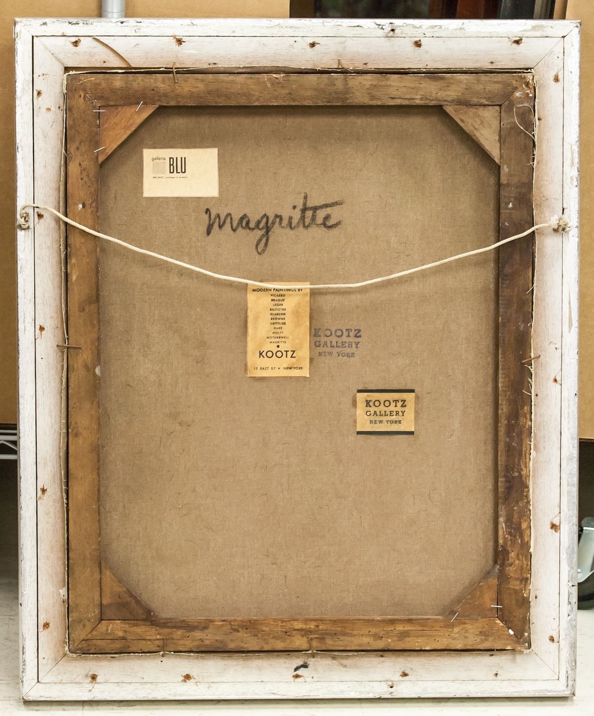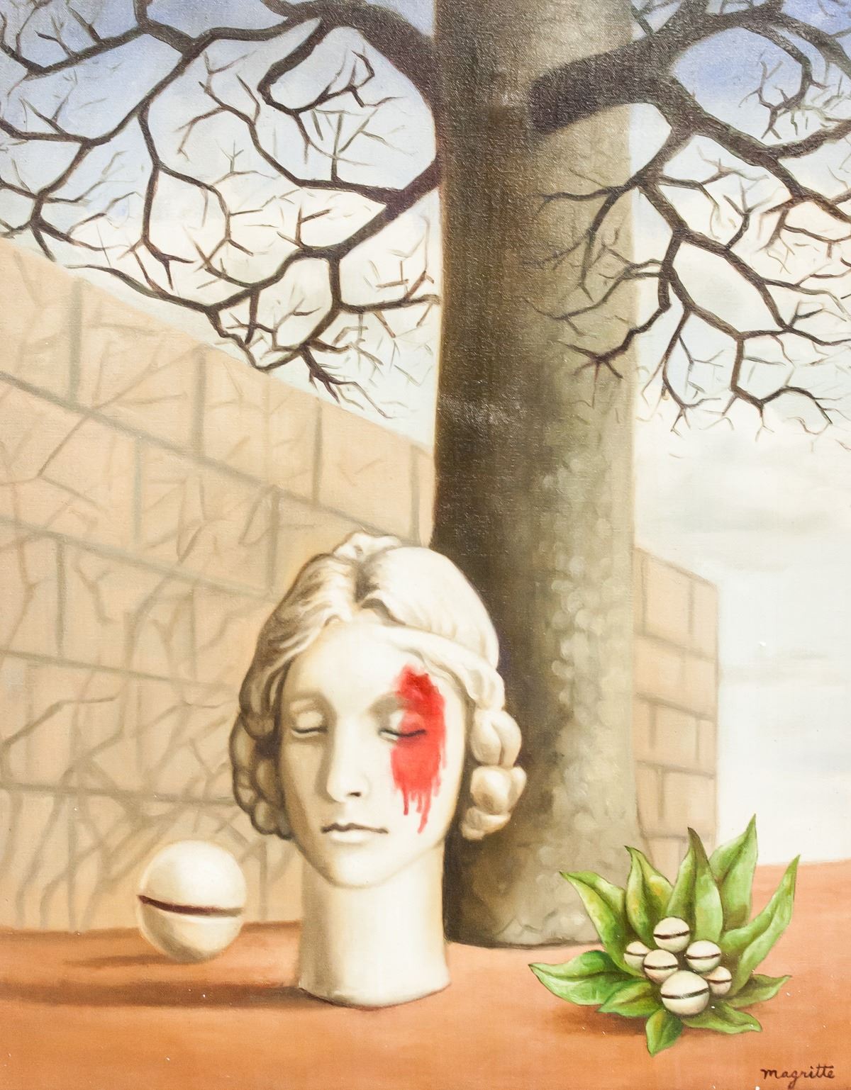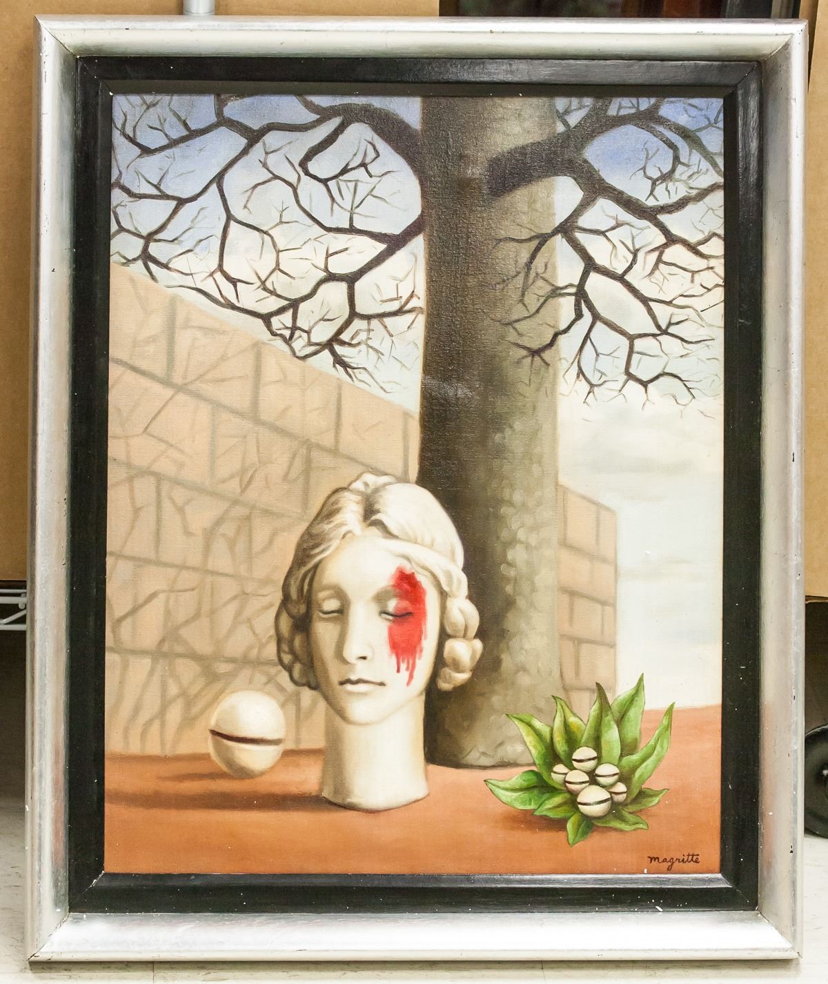 Oil on canvas, framed. Featuring surrealist composition of a head sitting on the ground with a splash of vivid red by the right eye. Signed "magritte" in the bottom right corner. Inscribed with "magritte" on verso. Labels affixed to vero read "galleria BLUE MILANO", "KOOTZ", and "KOOTZ GALLERY NEW YORK". Stamped with "KOOTZ GALLERY NEW YORK". Attributed to Rene Magritte (1898-1961, Belgian). Canvas size: 63 x 50 cm (24.5 x 19.75 inches). Frame size: 74 x 61 cm (29 x 24 inches).