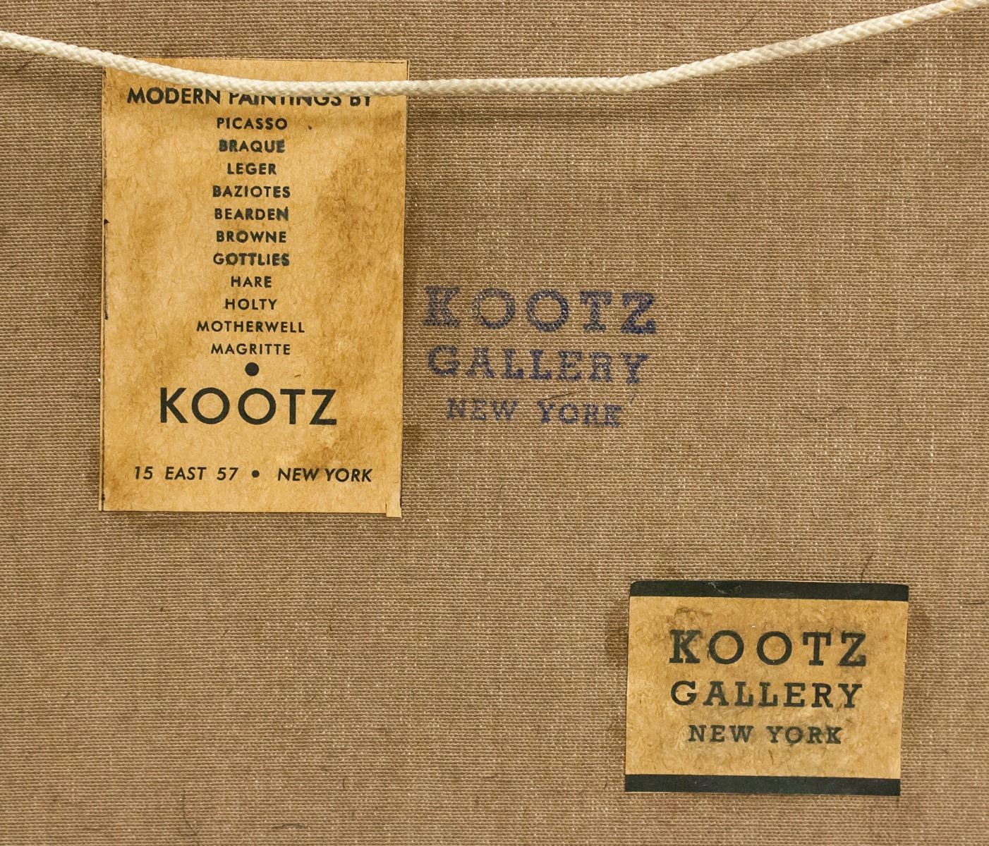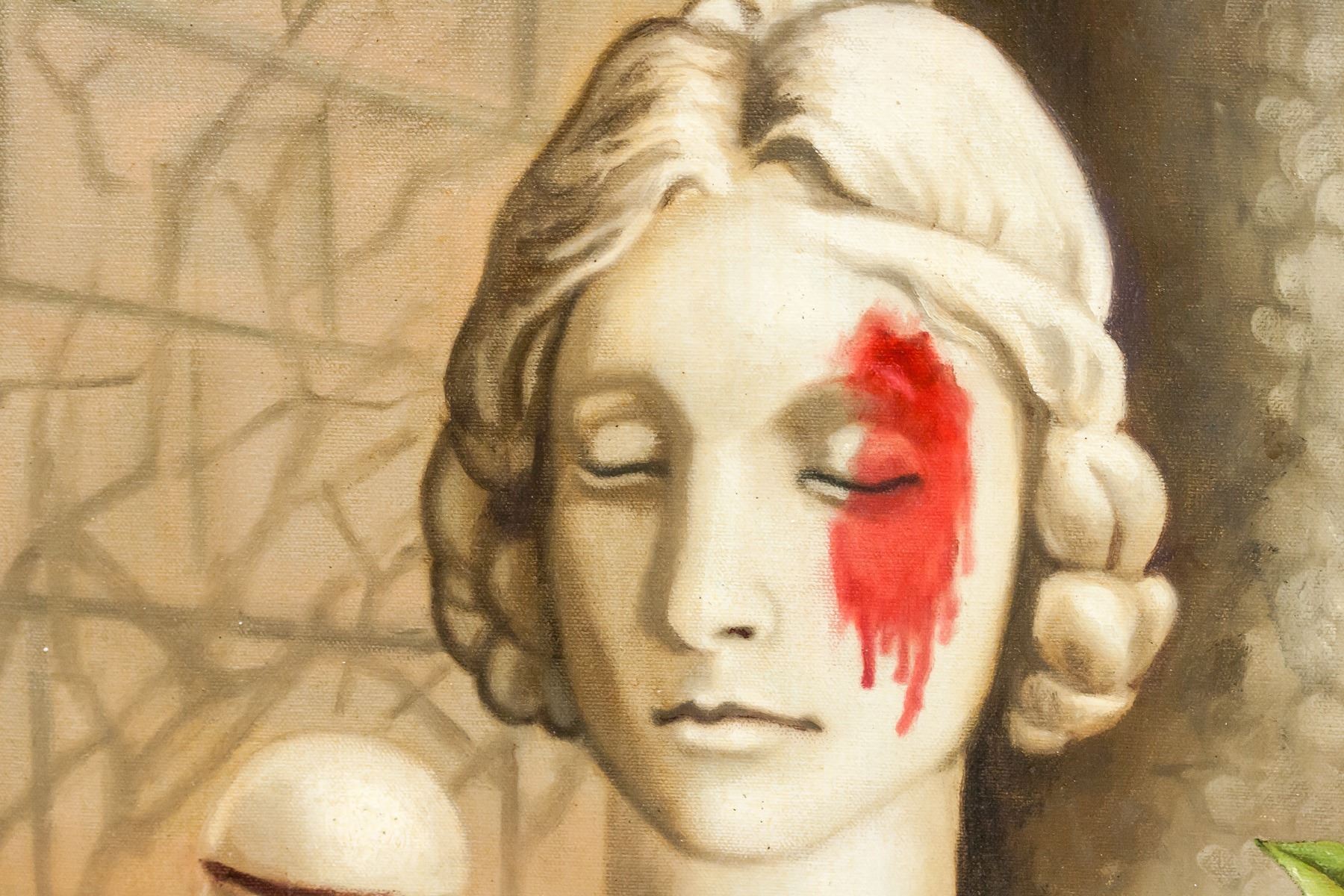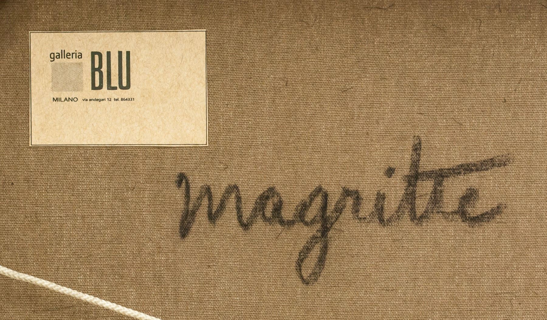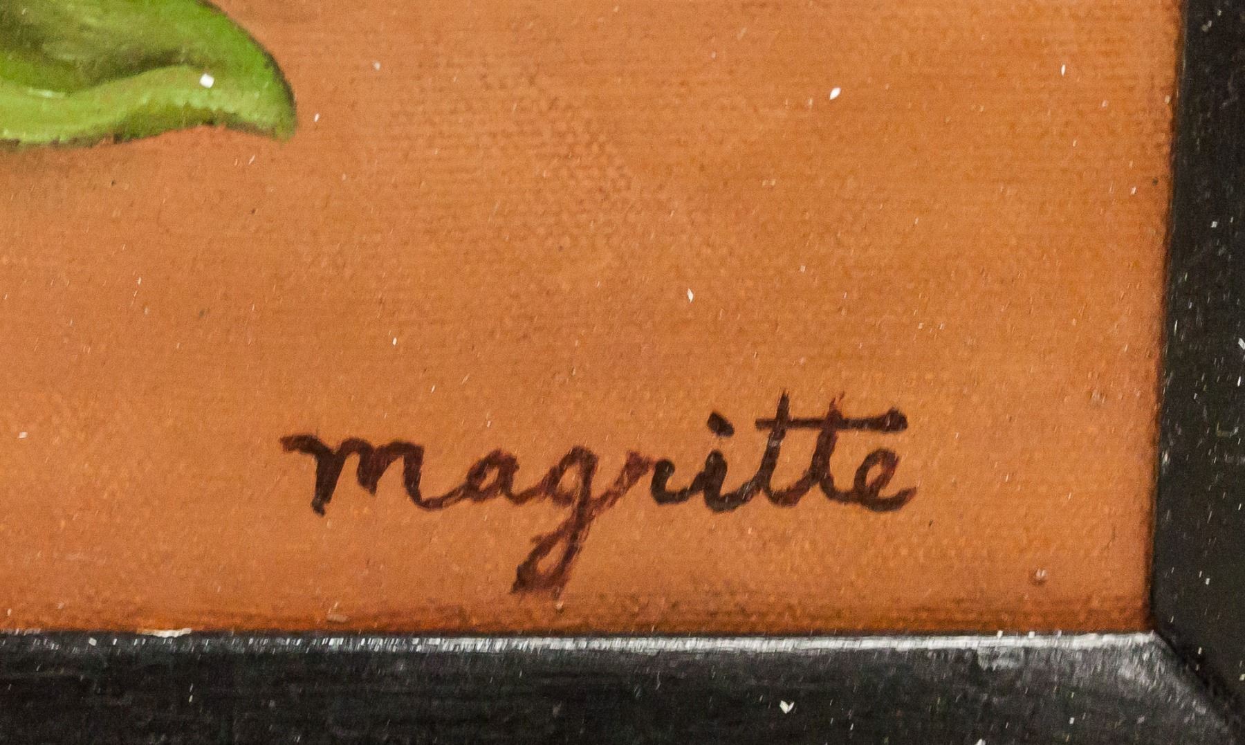 Oil on canvas, framed. Featuring surrealist composition of a head sitting on the ground with a splash of vivid red by the right eye. Signed "magritte" in the bottom right corner. Inscribed with "magritte" on verso. Labels affixed to vero read "galleria BLUE MILANO", "KOOTZ", and "KOOTZ GALLERY NEW YORK". Stamped with "KOOTZ GALLERY NEW YORK". Attributed to Rene Magritte (1898-1961, Belgian). Canvas size: 63 x 50 cm (24.5 x 19.75 inches). Frame size: 74 x 61 cm (29 x 24 inches).