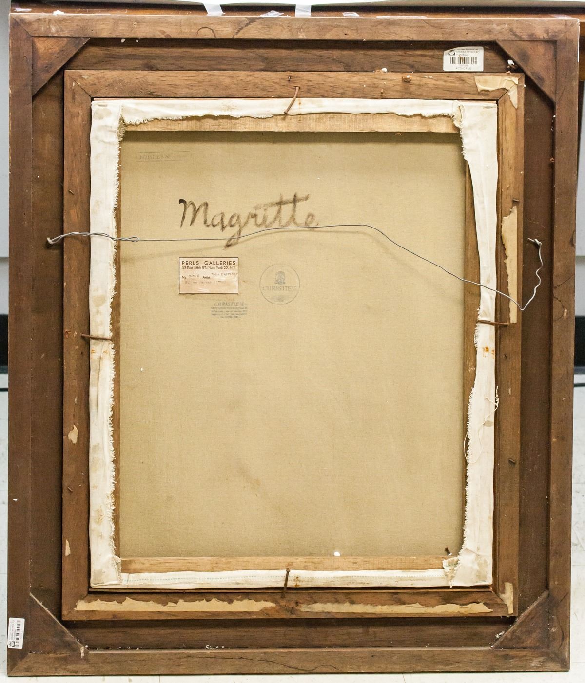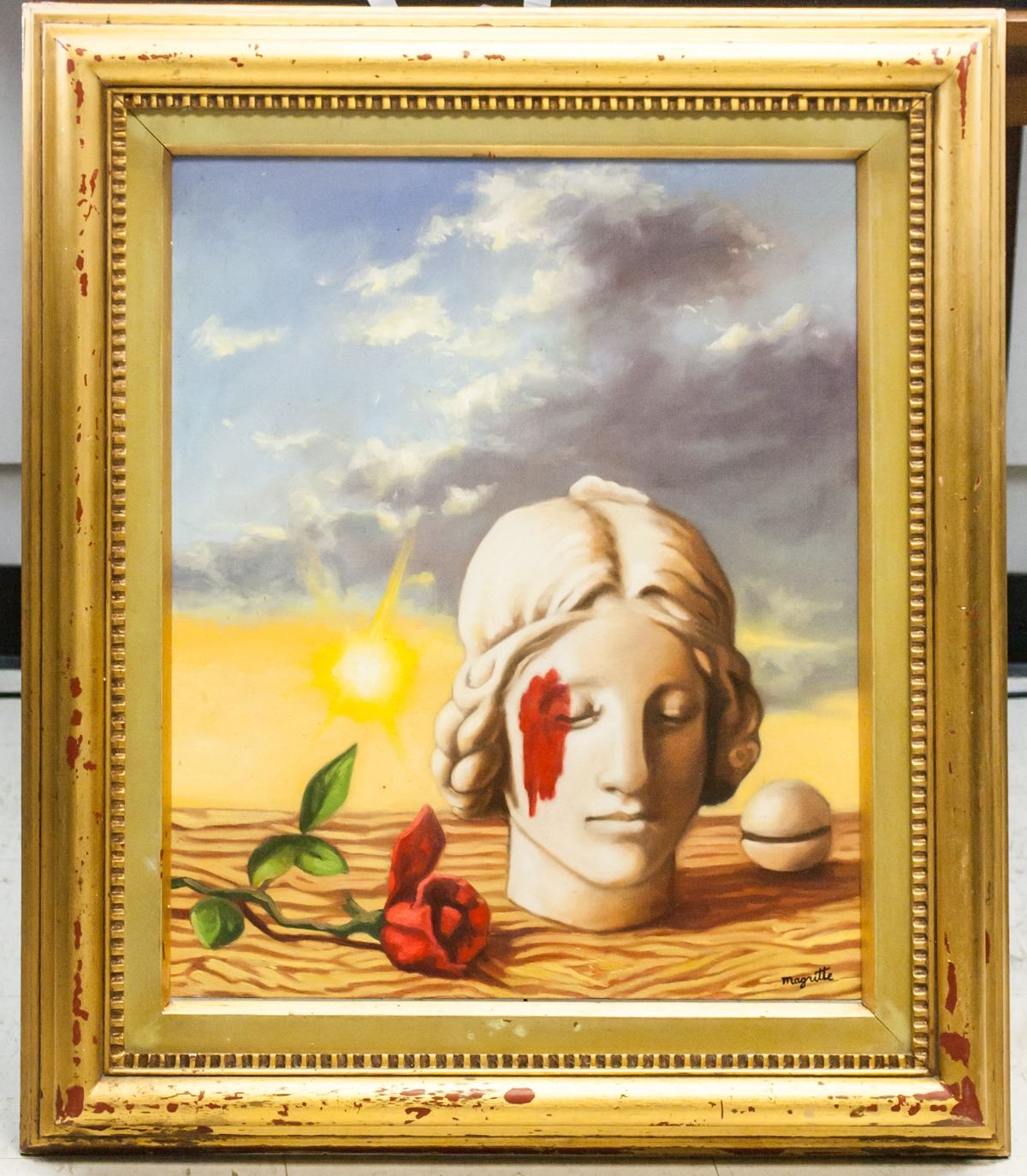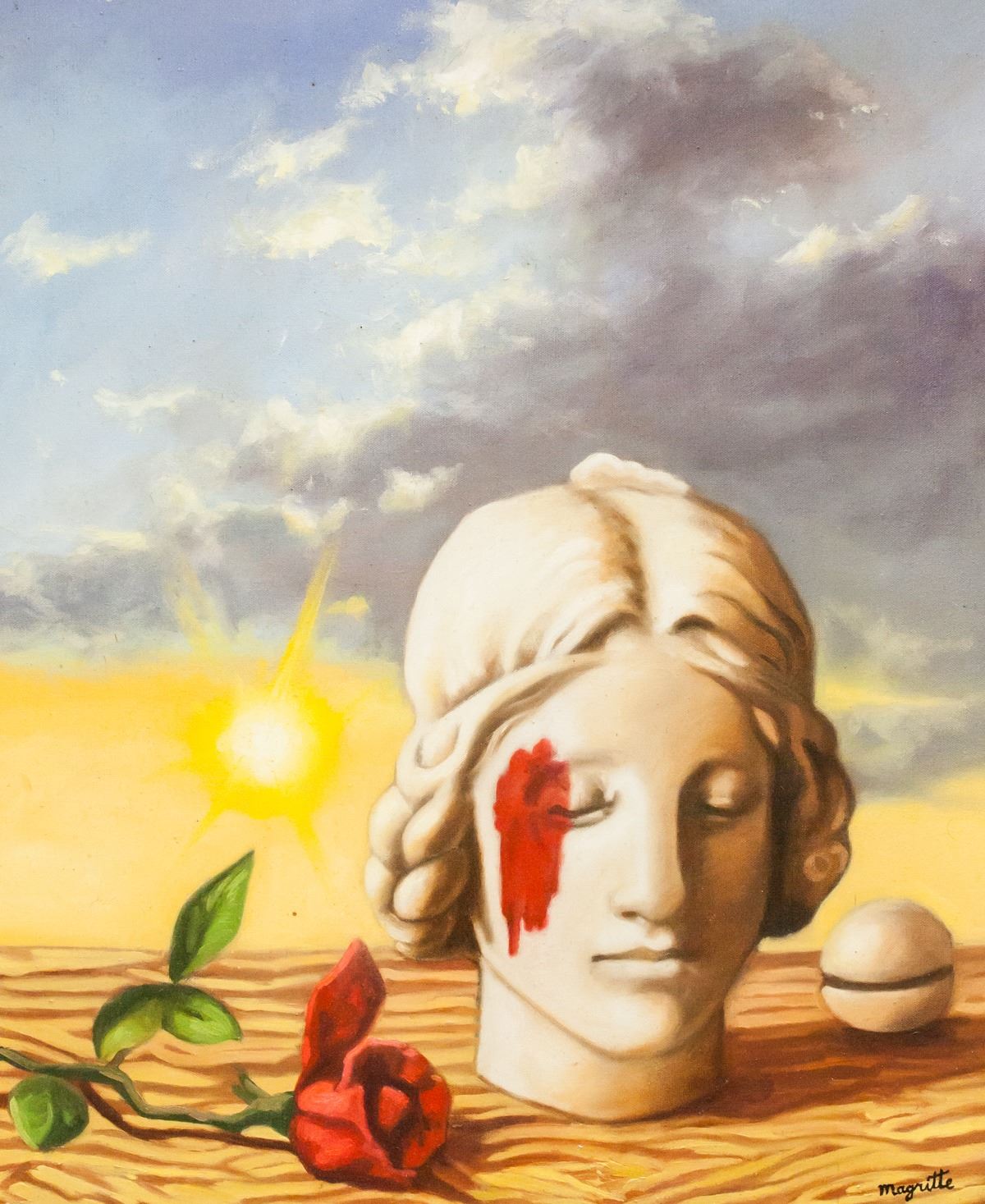 Oil on canvas, framed. Featuring surrealist composition of a statue of a woman's head splashed with red paint resting in the desert. Signed "magritte" in the bottom right corner. "magritte" inscribed on verso. Accompanied with one label and two stamps. The label reads "PERLS GALLERIES". The two stamps both read "CHRISTIE'S". One more illegible stamp on verso. Attributed to Rene Magritte (1898-1967, Belgian). Canvas size: 60 x 50 cm (23.75 x 19.75 inches). Frame size: 82 x 71 cm (32.25 x 28 inches).
