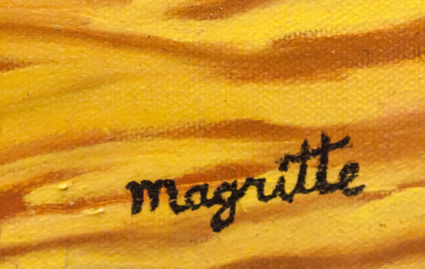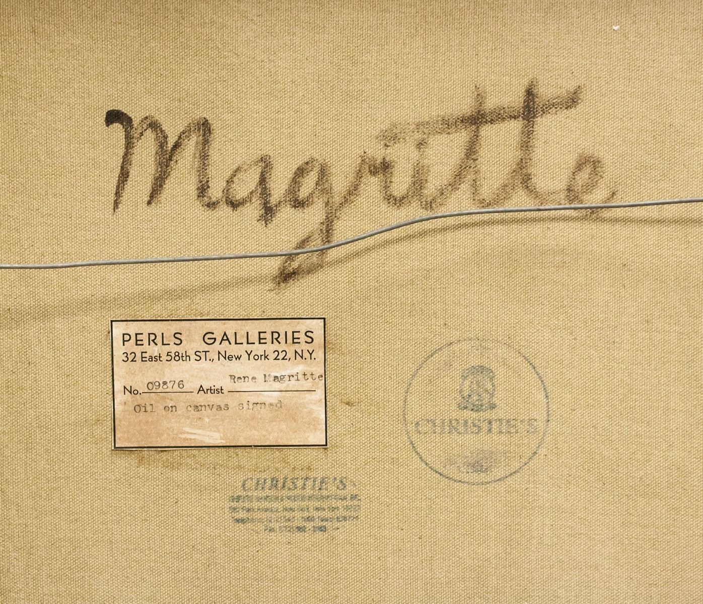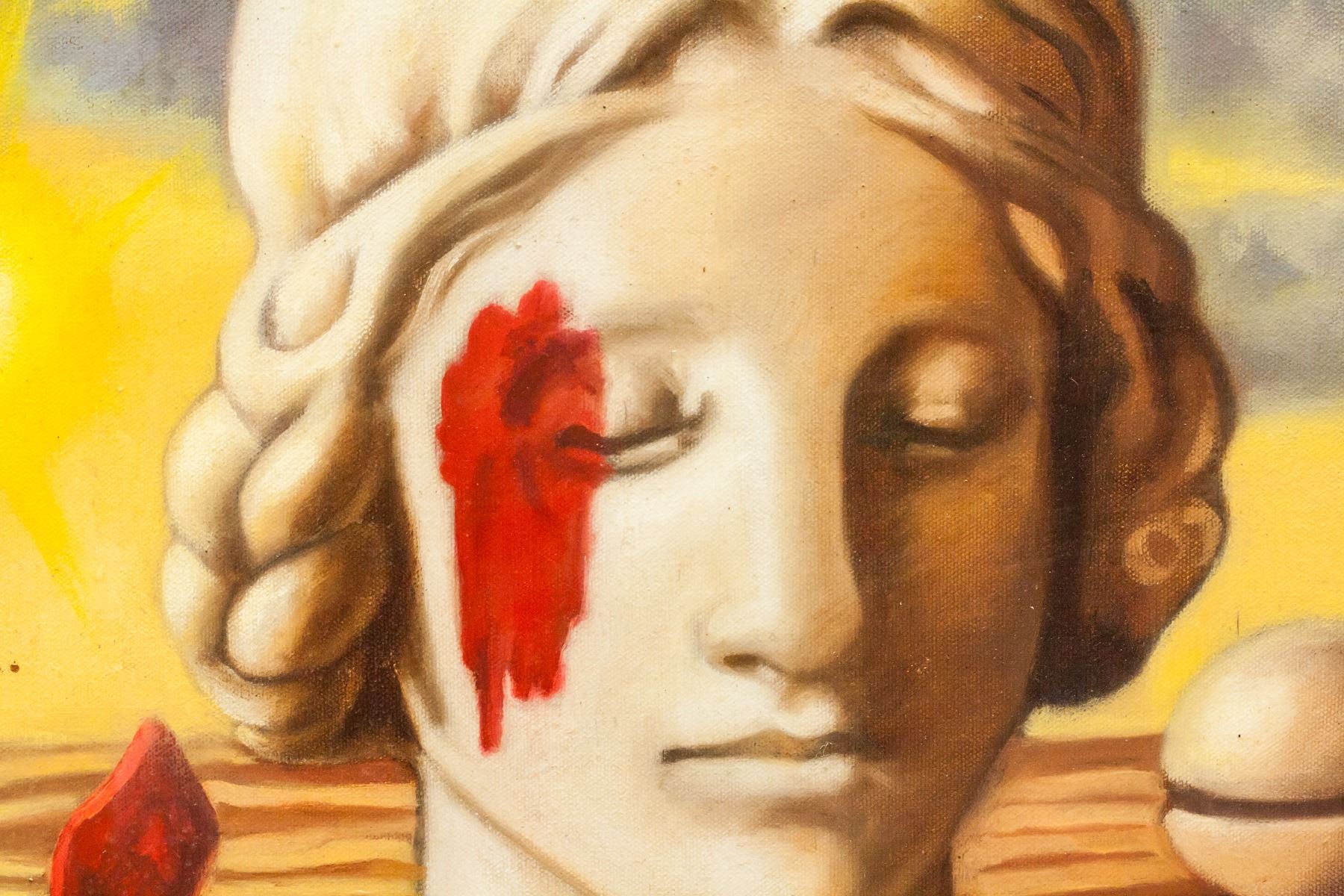 Oil on canvas, framed. Featuring surrealist composition of a statue of a woman's head splashed with red paint resting in the desert. Signed "magritte" in the bottom right corner. "magritte" inscribed on verso. Accompanied with one label and two stamps. The label reads "PERLS GALLERIES". The two stamps both read "CHRISTIE'S". One more illegible stamp on verso. Attributed to Rene Magritte (1898-1967, Belgian). Canvas size: 60 x 50 cm (23.75 x 19.75 inches). Frame size: 82 x 71 cm (32.25 x 28 inches).