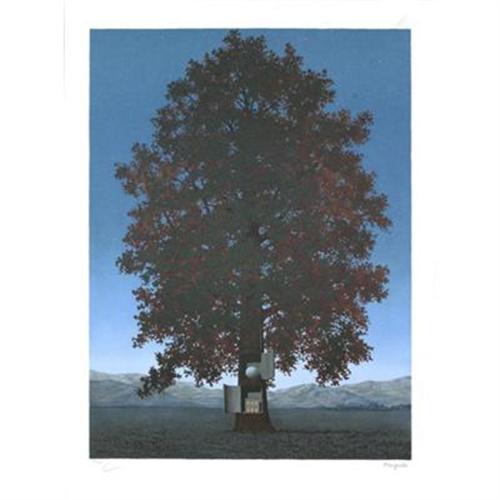 Notes:Lithograph after (d'apres) Magritte, facsimile signed with Magritte Estate watermark, authorized by ADAGP, France. Printed on pure chiffon, Velin de Rives, 300 gr/square meter. This image was recreated by a master engraver and required over eighteen passes through a flat-bed lithographic press to be completed. Each print is signed in the plate, stamped with the seal of the Magriite Estate and signed by the publisher on the verso. This is part of an editon of 300 and measures 23 x 31 inches. La Voix Du Sang (Voice of Blood) was done in 1959 and it is part of the Musee d'Art Moderne, Stifung Ludwig in Vienna, Austria. "The sphere and the house suggest enigmatic measures to the tree. Curtains hide the unnecessary". René Magritte(1950).