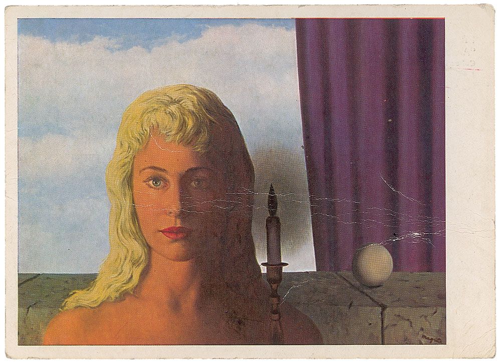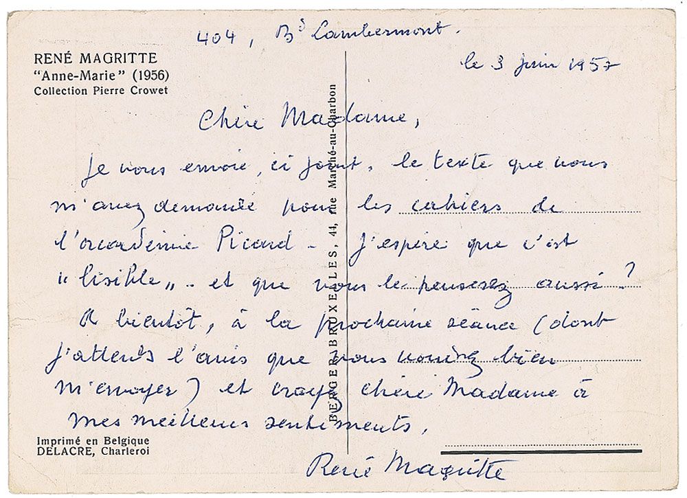 Belgian artist (1898–1967) best known for his paintings in a surrealist, humor-tinged style, often incorporating such trademark elements as bowler hat–wearing men, windows, eyes, and female torsos. ALS in French, one page on a 5.75 x 4.25 postcard depicting his 1956 work entitled ‘Anne-Marie,’ June 3, 1957. Untranslated. Creases affecting the image on the front of the postcard but not the reverse, otherwise fine condition.