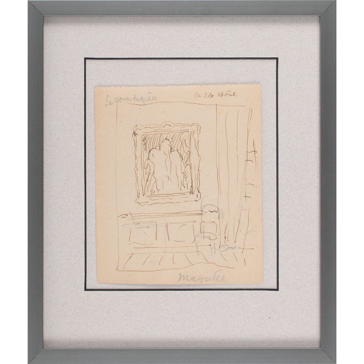 Extremely desirable fountain pen and pencil sketch accomplished by Magritte on an off-white 4 x 5 sketchbook page, August 26, [1946], titled at the top in pencil, “Le coup de grace,” and signed in the lower border in pencil, “Magritte.” The sketch shows an interior scene with a large painting hanging on the wall. Mounted, matted, and framed to an overall size of 7.5 x 9. In fine condition, with uniform toning.