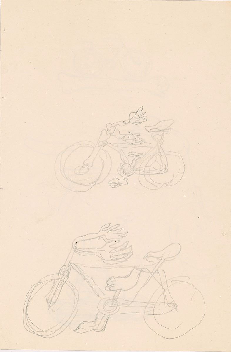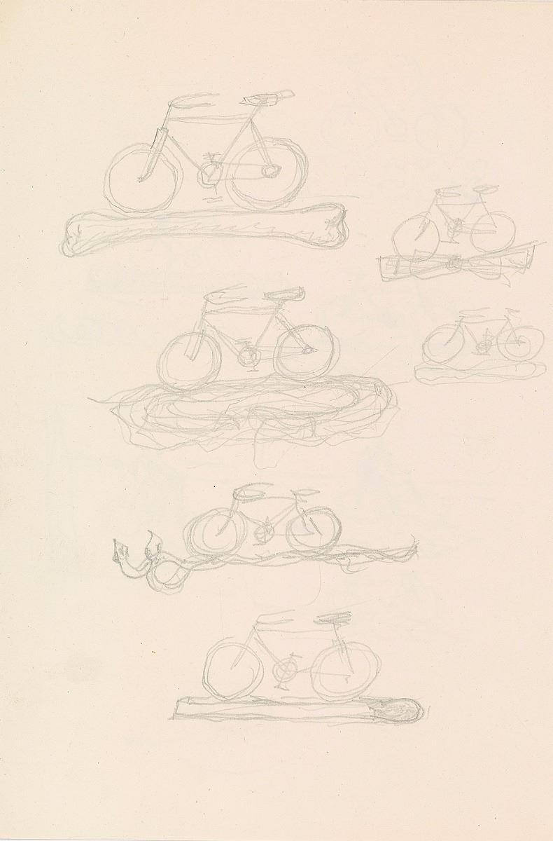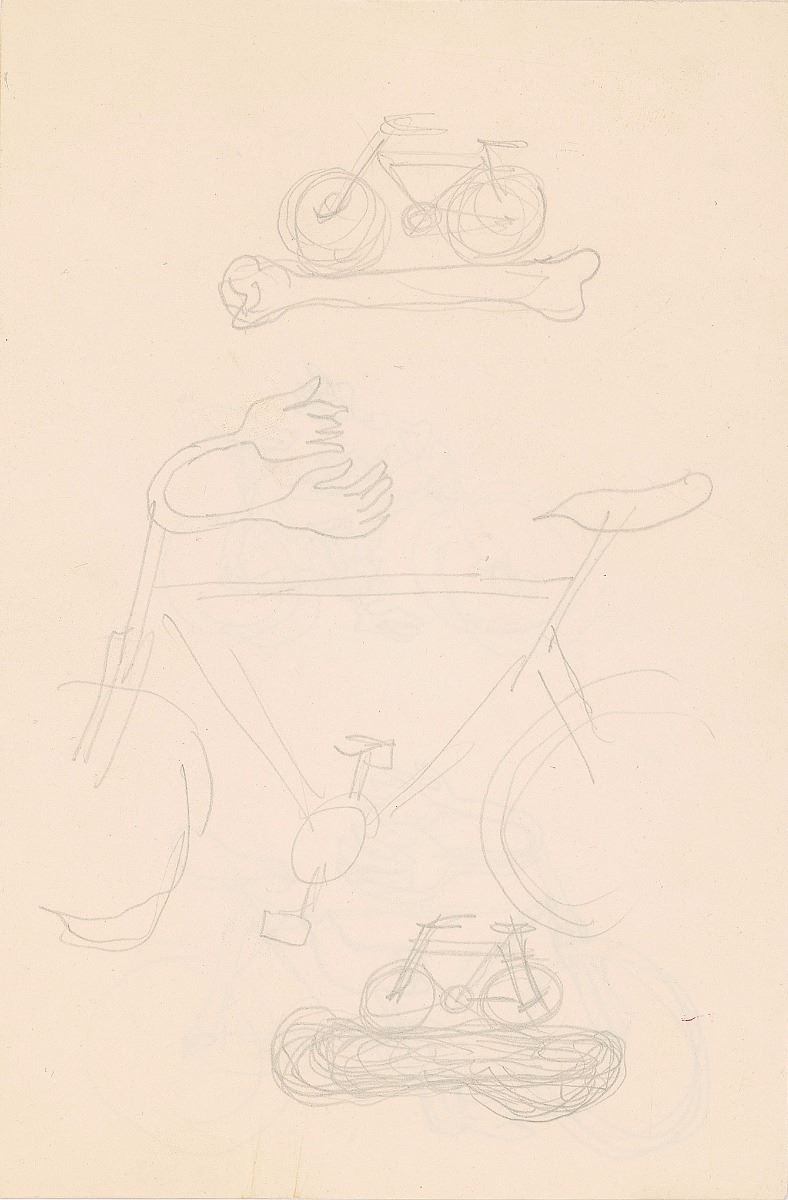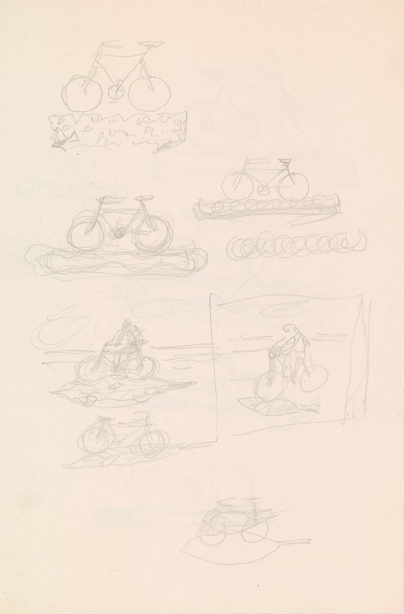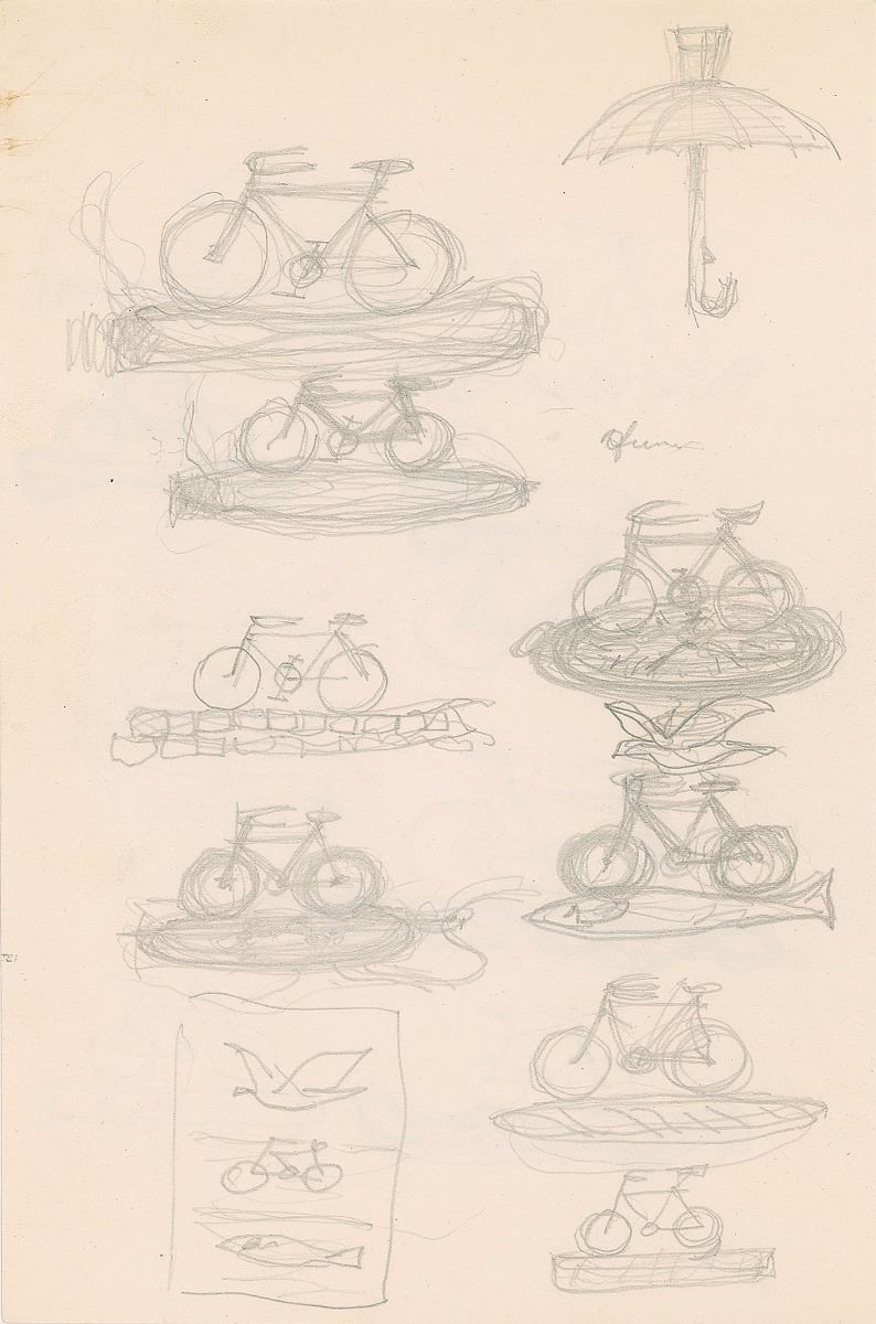 Magnificent series of original preliminary pencil sketches accomplished by Magritte on both sides of three off-white 5.25 x 8 sheets, no date but circa late 1950s. The sketches include one of a glass of water balanced atop an open umbrella, as seen in his 1957 work ‘Hegel’s Holiday,’ and thirty-five separate renderings of bicycles atop various objects, as seen in his 1959 painting ‘State of Grace.’ In overall fine condition. Originates from the collection of art critic Suzi Gablik, who wrote a monograph on Magritte.