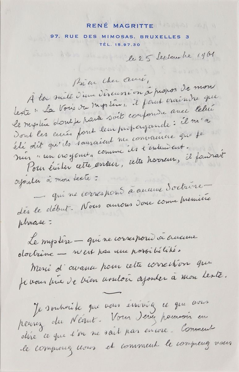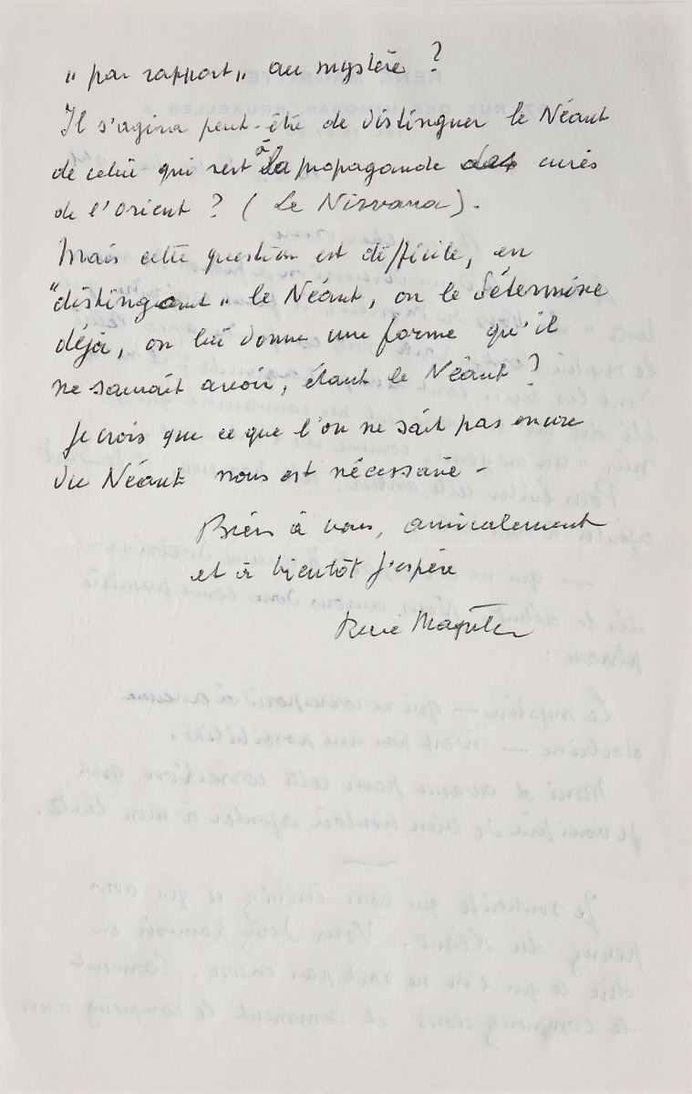 ALS in French, one page both sides, 5.25 x 8.5, personal letterhead, September 25, 1961. Letter to Belgian poet Andre Bosmans, concerning his article ‘La voix du mystere’ to be published in Rhetorique, a review founded by Bosmans. In part (translated): “The mystery I’m talking about must not be confused with the mystery used by the priests to make their propaganda…I’m told that they claim that I’m ‘a believer,’ as they understand it. To avoid that error, that horror…it is necessary to begin my text with the words: ‘…Mystery conforms to no doctrine whatsoever…Maybe ‘nothingness’ should be differentiated from the Nirvana in Oriental priest-propaganda,” In fine condition.