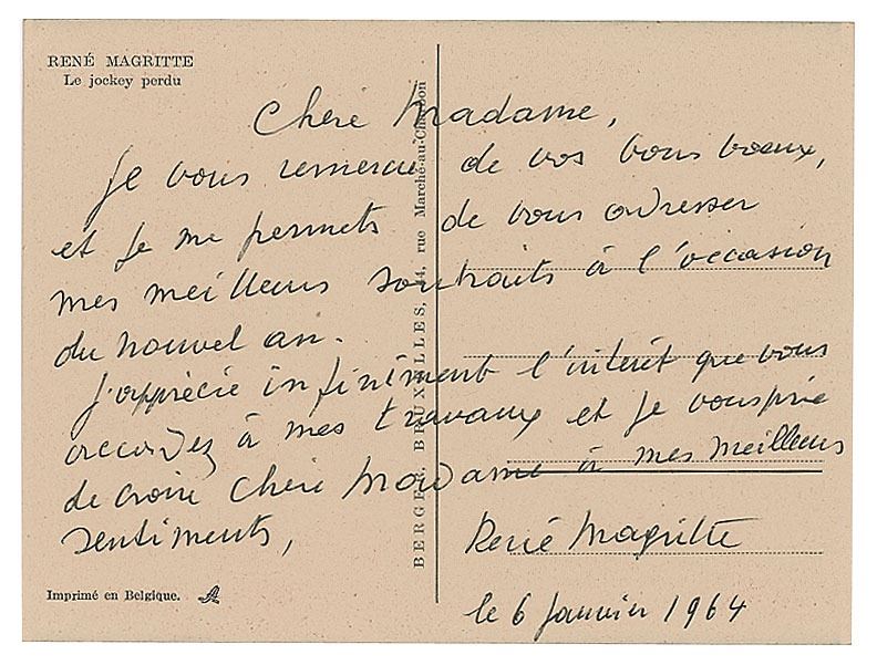 ALS in French, one page on a 5.5 x 4.25 postcard of his painting 'Le Jockey Perdu,' January 6, 1964. Letter to a lady, in part (translated): "I thank you for your prayers, and I allow myself to order you my best wishes on the occasion of the New Year. I very much appreciate the interest you have in my work." In fine condition. A desirable letter from the master surrealist.