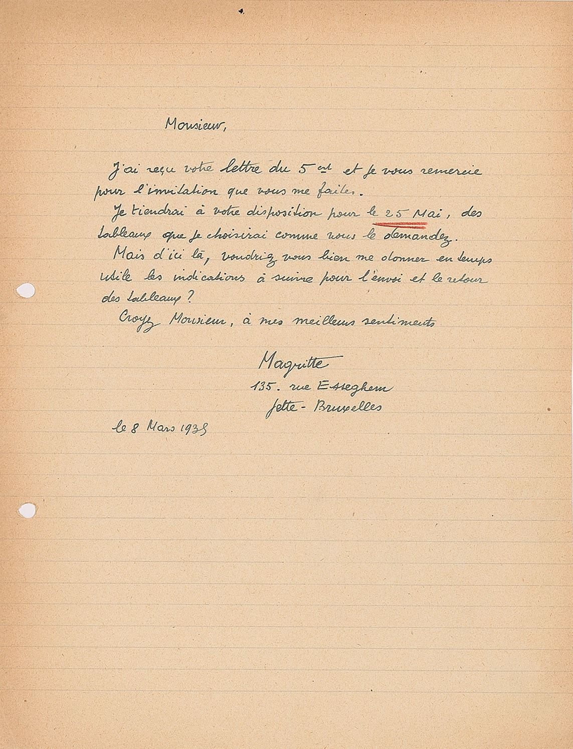 ALS in French, signed “Magritte, 135 rue Esseghm, Jette-Bruxelles,” one page, 8.25 x 11, March 8, 1938. Letter to a gentleman, in full (translated): "I received your letter of the 5th and I thank you for the invitation you make to me. I will hold at your disposal for May 25th, paintings that I will choose as you request. But until then, could you please be so kind and give me in good time the instructions to follow for sending and returning the paintings?" In fine condition, with two file holes to the left side.