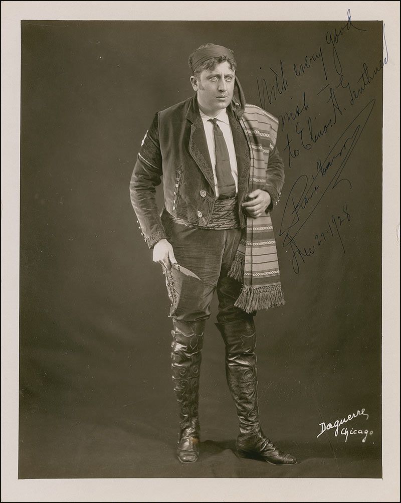 Vintage pearl-finish 8 x 10 full-length photo of Maison in character, signed and inscribed in blue ink “With every good wish—to Edward A. Gerthner, Rene Maison Dec 27–1928.” In fine condition, with some scattered light silvering and a ding to right edge.