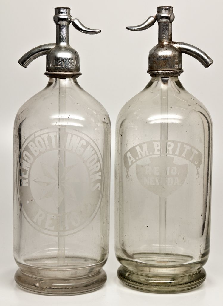 Lot of 2 different versions of Reno Bottling Works. 1) Reno Bottling Works, logo is etched. Measures about 12” with top. Top is from Valley Seltzer. 2) Another version of Reno Bottling Works, A.M. Britt, etched. Measures about 13” with top. Top is from the SY-LOU Bev 67, c1906-1914. Arthur M. Britt started Reno Bottling Works in 1906. In 1914, Britt bought the rights to brew Buffalo Beer, he decided to change the name to Buffalo Bottling Works, hoping the name association would help the business [Ref: Nevada History Through Glass, Fred Holabird, 2012, pp 113-4]. - Jacobitz Collection -59393