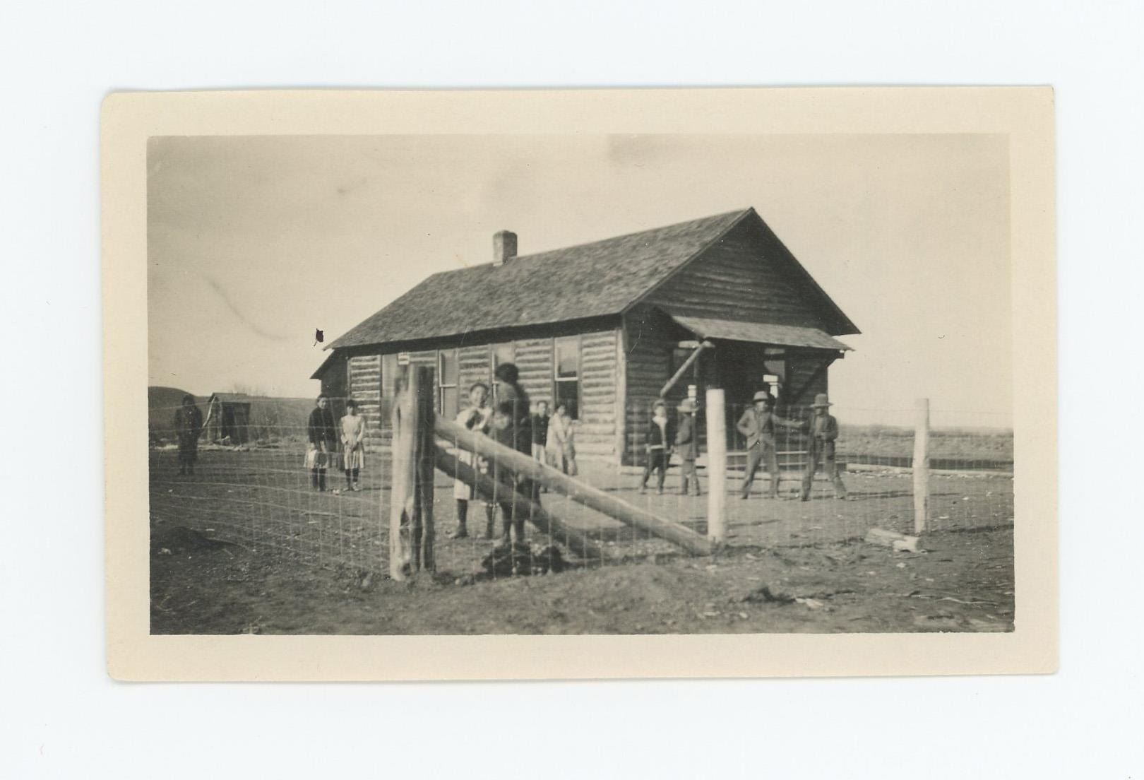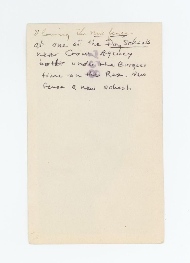 Title on Back: Showing the new fence at one of the Day Schools near Crow Agency built under the Burgess time on the Rez. New Fence and new School. 2 3/4" by 4 1/2". Provenance: Aline Natalie Burgess Claremont Los Angeles, daughter of James Gregor Burgess builder of the Burgess Baptist Church Crow Agency Montana, through Decent.