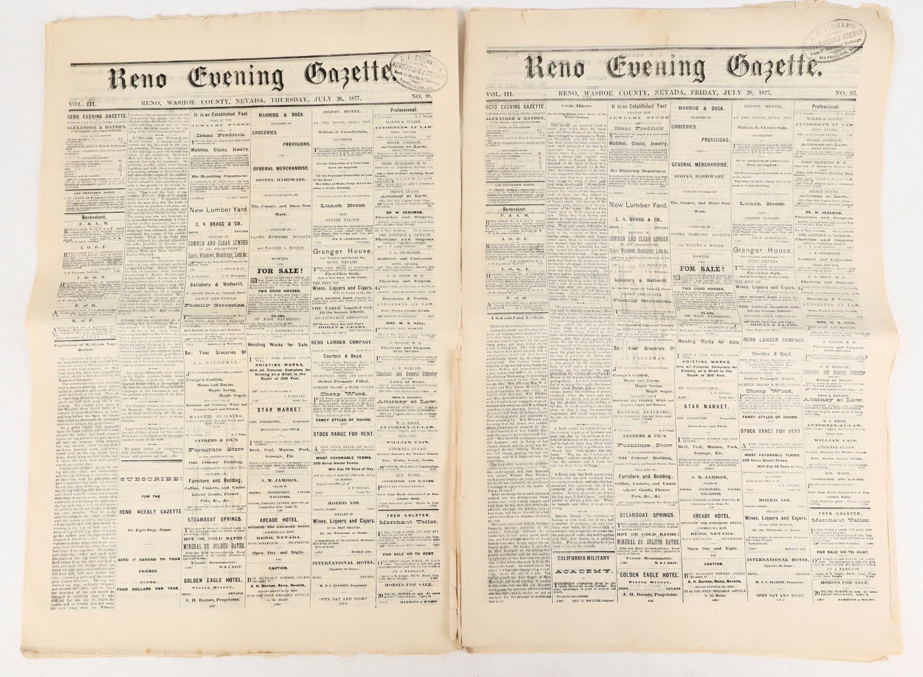 Lot of 6 different issues of the Reno Evening Chronicle, July 20-26, 1877. Get it for the local ads! (and interesting articles) Rough edges, some rips.